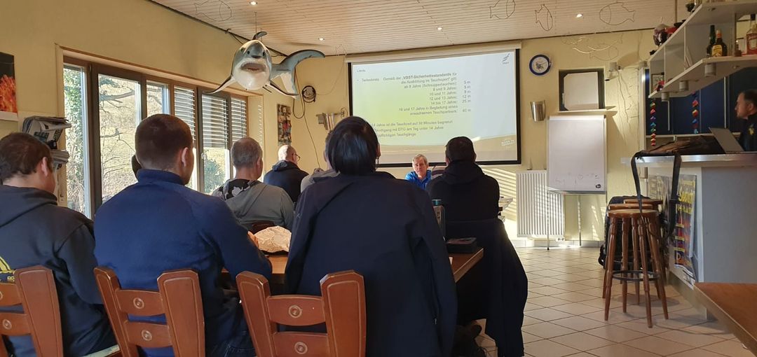 Der nächste Tag startete früh um 9:00 Uhr im Vereinsheim von der Tauchsportgruppe Klingenmünster e.V. in Klingenmünster. Dankbarerweise gab es eine sehr gute Versorgung mit Kaffee und so stand der ersten Theorieeinheit, nach einer kleinen Vorstellungsrunde, die bewusst während der Online-Theorie ausgelassen wurde, auch nichts mehr im Wege. Nach einer kurzen Einweisung in den folgenden Tagesablauf startete schon der erste Referent mit dem Thema Prävention, gefolgt von Grundlagen zur Freiwasserausbildung. Während der folgenden Kaffee- und Verschnaufpause stellten die Ausbilder zufrieden fest, dass genügend Kinder für die anschließende Schwimmbadausbildung zur Verfügung standen und sogar schon im Vereinsheim erschienen sind. Im zweiten Teil der Theorieeinheit drehte sich alles um die Schwimmbadausbildung und die anschließende Praxisaufgabe, die die Teilnehmer in einer kurzen Partnerarbeit vorab schon einmal ausarbeiten und besprechen sollten, um später für einen reibungslosen Ablauf zu sorgen. Zum Abschluss der Theorie-Einheit präsentierte uns Gerd noch eine kurze schriftliche Prüfung, vor der sich keiner fürchten musste, der am Kurs aufmerksam teilgenommen hatte. Als Belohnung folgte ein ausgiebiges Mittagessen, dank ansässigem Lieferdienst, und noch die Möglichkeit sich untereinander auszutauschen sowie eine Führung durch das beeindruckende Materiallager und den Technikraum des Vereins zu bekommen.