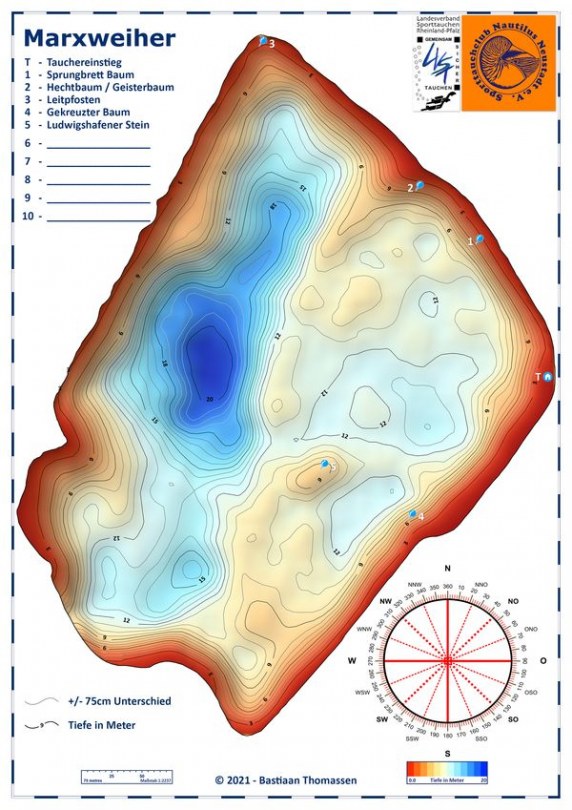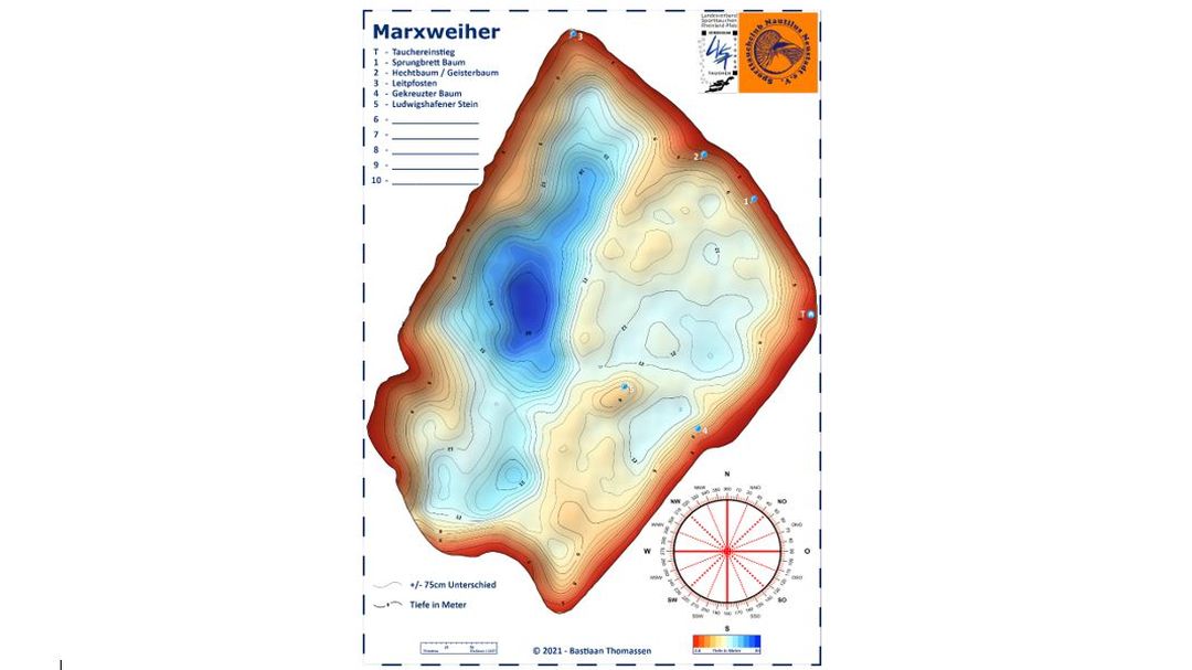 Über die Zeit haben unsere Mitglieder im Marxweiher andere Tauchrouten, als die typischen „Links herum“ oder „rechts herum“ Tauchgänge, entwickelt. Denn die Karte lädt zum Entdecken ein.
