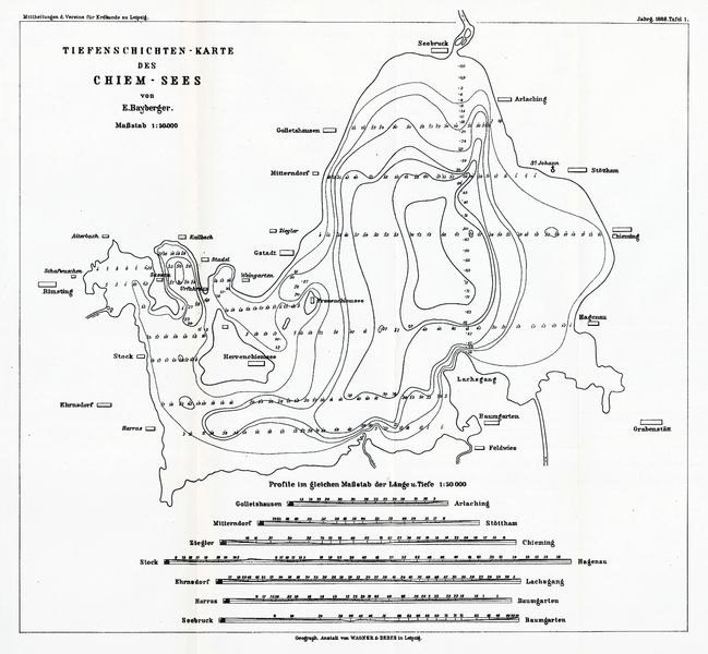 Noch bis ca. 1915 war diese Vermessung sehr aufwendig, da in einem regelmäßigen Abstand ein Gewicht an einem Seil herabgelassen wurde. Dadurch hat sich ein grobes Raster mit den Tiefen ergeben. Anhand dieser konnte man dann von Hand eine Karte mit Tiefenlinien zeichnen. (Fig. 1a)