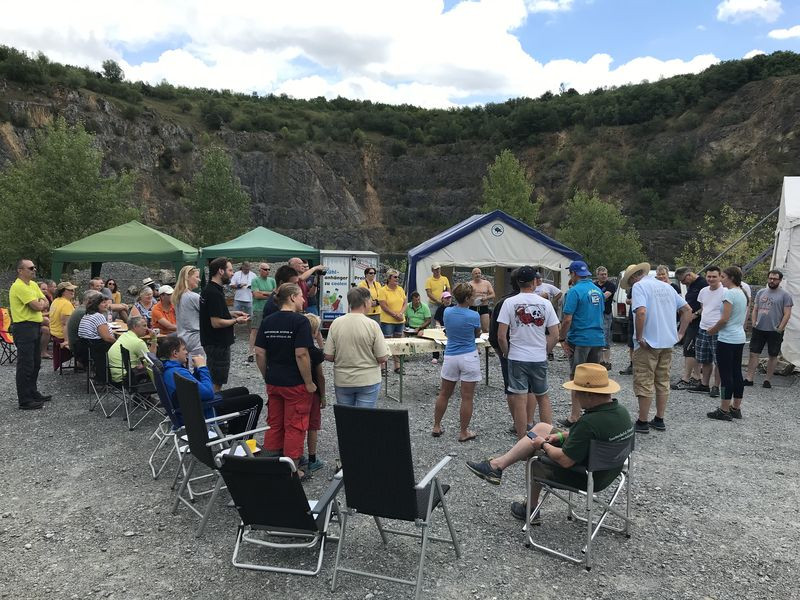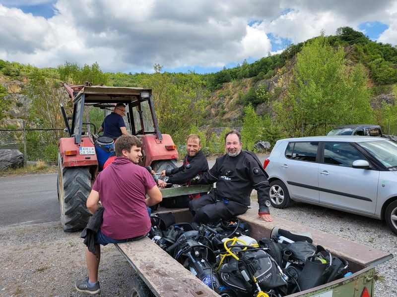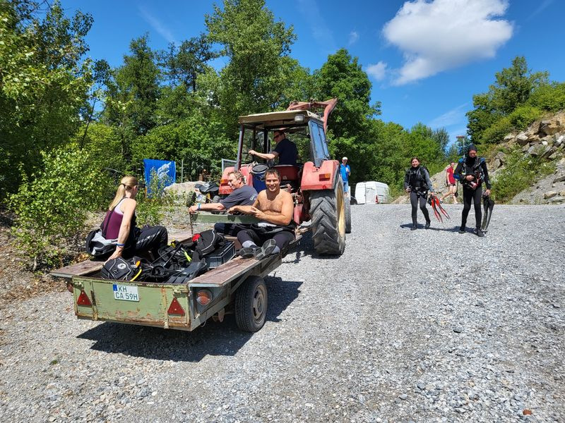Praktischer Weise ist bei Stromberg, also in Rheinland-Pfalz einigermaßen zentral gelegen, ein ehemaliger Kalksteinbruch vollgelaufen und der darf seit ein paar Jahren betaucht werden. Genau dort fand unsere Jubiläumsfeier als Tauchevent statt, d. h. Rüdiger hat seine Tauchbasis “Hunsfels Tauchen” und damit den Hunsfels an diesem Wochenende nur für uns geöffnet. Er und sein Team haben überall mit angepackt und uns sozusagen mit einem „Rundum-Sorglos-Paket“ verwöhnt. Da wurden Ausrüstungen runter an den See oder wieder nach oben gefahren und bei der Gelegenheit manchmal auch gleich deren Besitzer mitgenommen, der Kühlanhänger zum Abendessen und für den nächsten Tauchtag wieder zurück umgesetzt und Unmengen von Flaschen gefüllt und wieder zu ihren Besitzern zurückgebracht.