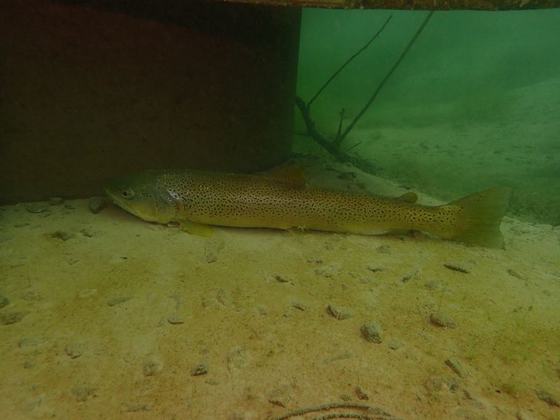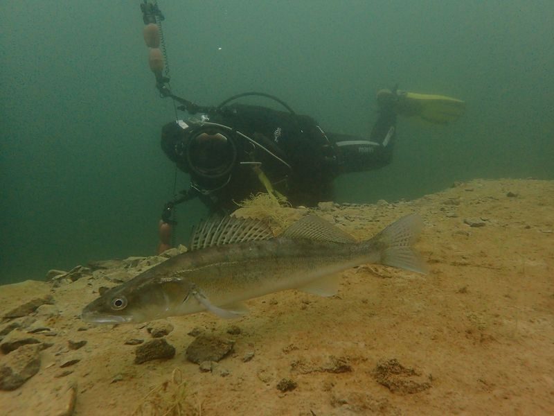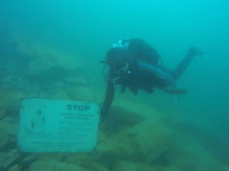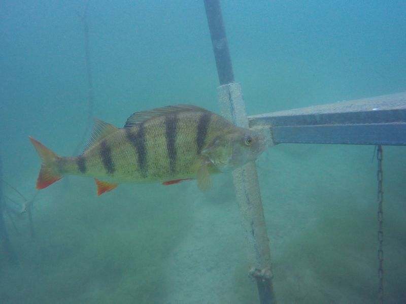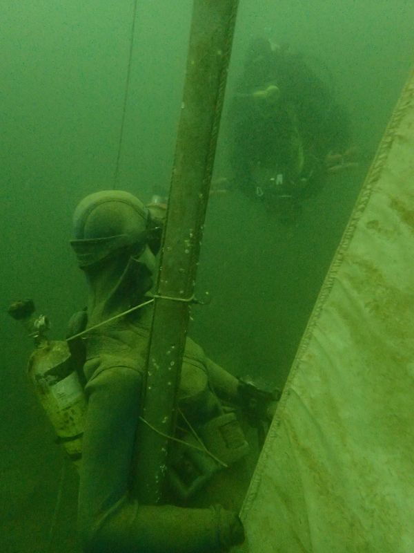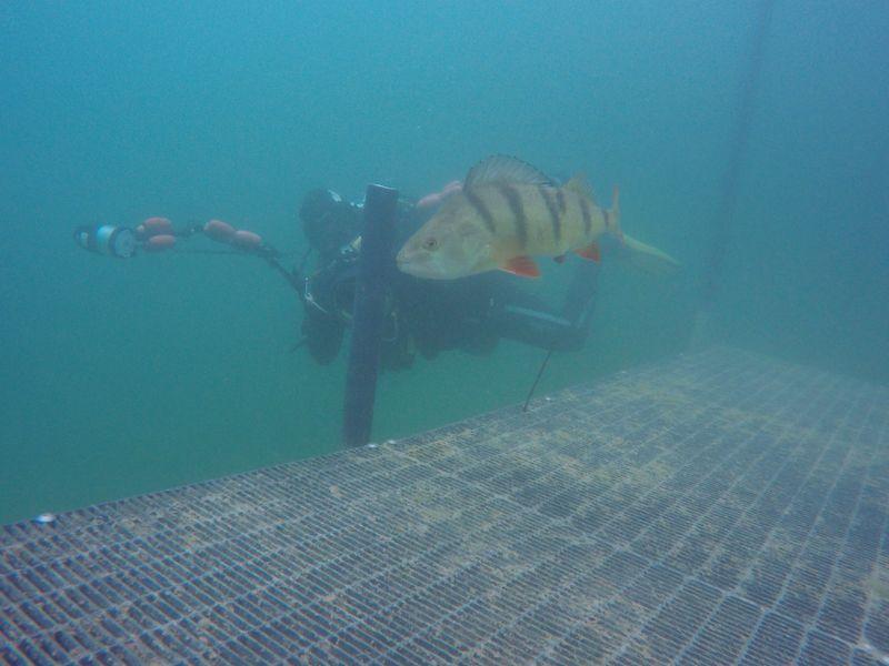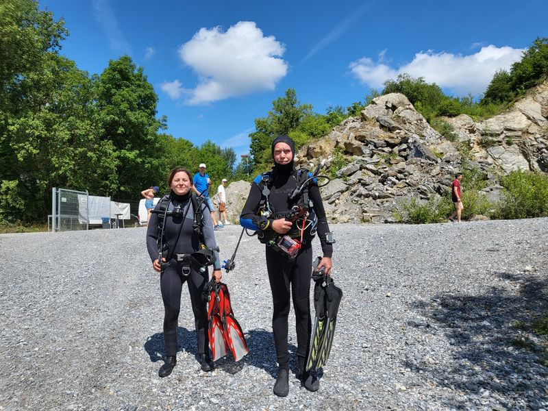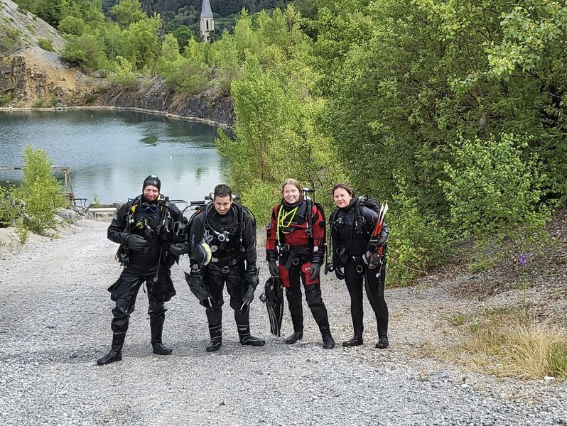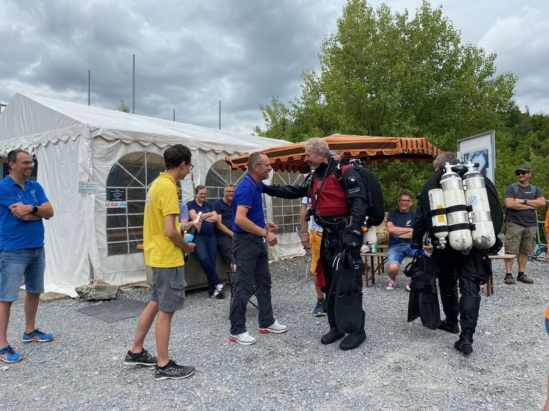 Viele LVST-Taucher:innen sind noch nicht im Hunsfels getaucht und so gab es für sie viel Neues zu entdecken. Es gibt dort Steilwände, versenkte Boote, Scheinwerfer, Schilder und auch Fische sind schon eingezogen. Dazu gibt es noch diverse Übungsplattformen und Ringe zum Durchtauchen. Die Sicht war zwar nicht berauschend, aber für einen See recht brauchbar (6-7 m, es gab in den letzten Tagen einige heftige Gewitter) und die Wassertemperaturen waren (zumindest oberhalb von 10 m) auch für Halbtrockentaucher erträglich. Oben gab es sogar eine Wohlfühlzone mit Temperaturen von über 20 Grad. Aber viele waren im Trocki unterwegs, die konnten auch mal entspannt auf 40 m abtauchen.