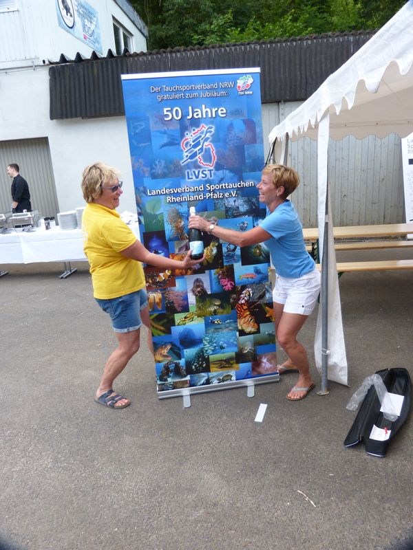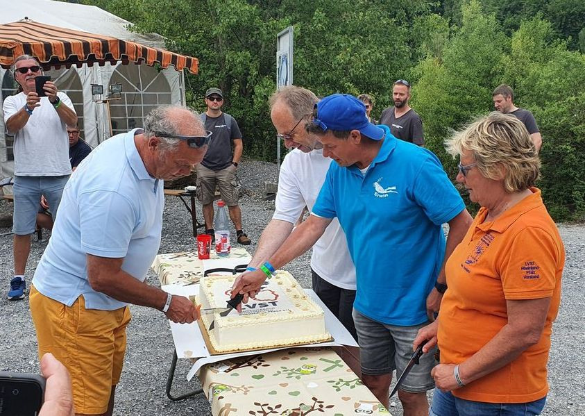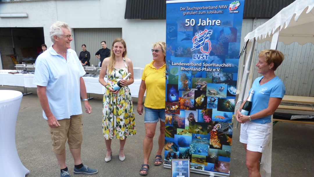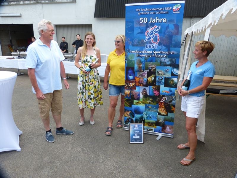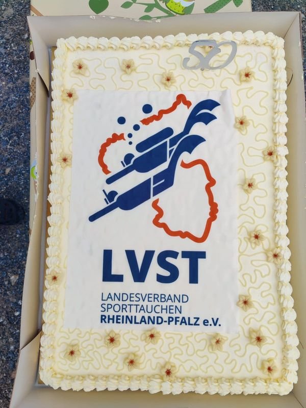 Bevor aber mittags die Geburtstagstorte, diesmal mit vereinten Kräften, angeschnitten wurde, wurde Peter Gaa, der seit vielen Jahren als Ausbilder im LVST tätig ist, ist mit der goldenen Ehrennadel des LVST ausgezeichnet. Die Laudatio hielt LVST-Präsidentin Ines. An diesem Tag war auch VDST-Präsident Uwe Hoffmann da. Er hatte natürlich auch ein Präsent für den Landesverband dabei und half nachher tatkräftig beim Tortenanschnitt mit. Zuvor erinnerte Erwin aber an die Gründer des LVST, die zum ersten Mal die rheinland-pfälzischen Tauchvereine unter einen Dachverband organisiert haben – und so letztendlich dieses Jubiläum erst ermöglicht haben.