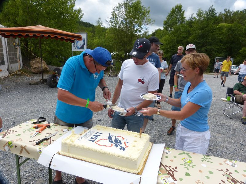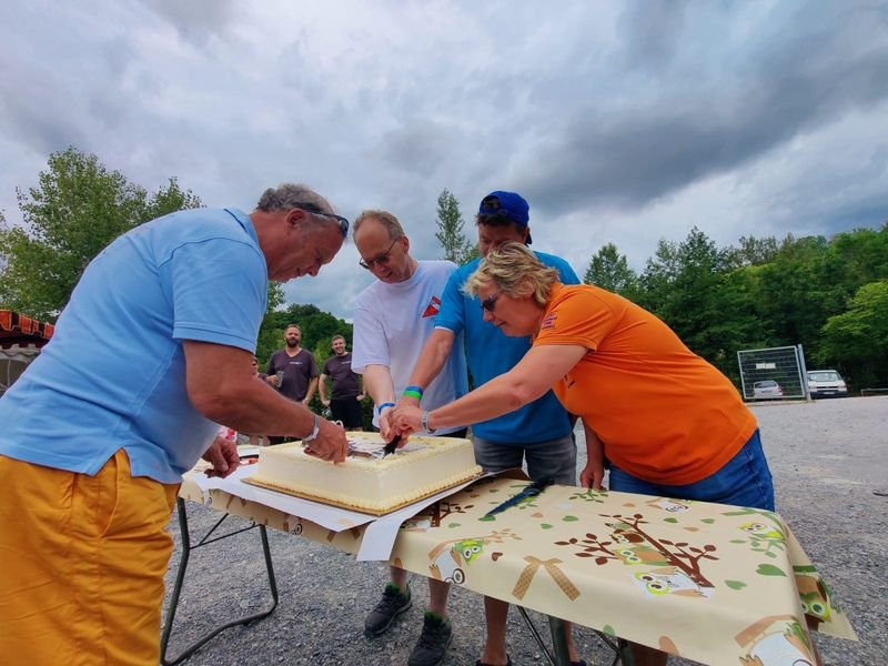 An beiden Tagen gab es zusätzlich je eine riesige Geburtstagstorte, die pünktlich um 13 Uhr in großer Runde von Erwin, dem Präsidenten vom TC Manta Mainz, einem der sieben Gründungsvereine, stilgerecht mit einem Tauchermesser angeschnitten und dann von den Feiernden verputzt wurde.