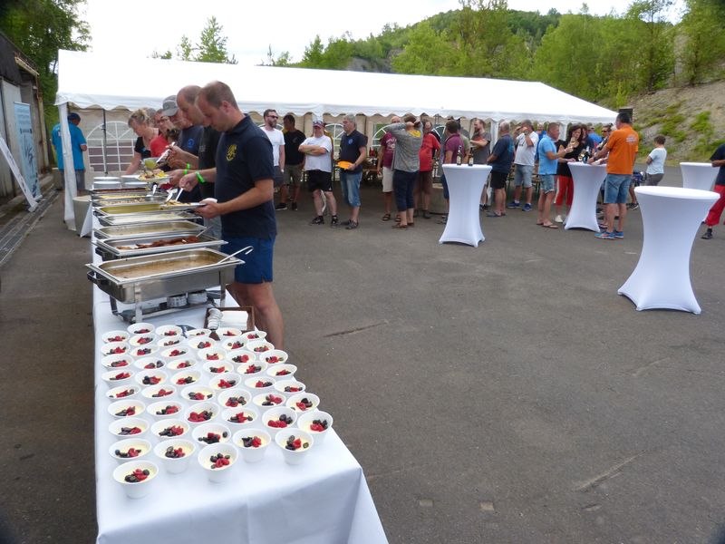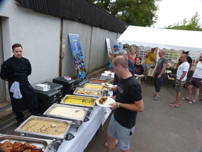Am Samstagabend wurde warmes Buffet vom Winzerkeller in Ingelheim serviert, das keine Wünsche offenließ und bei dem auch Vegetarier auf ihre Kosten kamen. Aber nach dem Abendessen war der Abend noch lange nicht zu Ende und die, die am Hunsfels übernachteten oder einen nicht zu langen Nachhauseweg hatten, saßen noch lange zusammen, bis sie von einem nächtlichen Regenschauer dann doch vertrieben wurden.