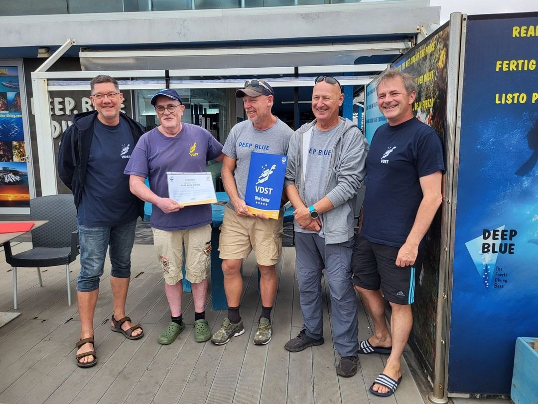 geplündert, um den anstehenden Strapazen vorzubeugen. Frisch gestärkt zog die Karawane geschlossen zur Basis und wurde von Basisleiter Volker vor Ort im Empfang genommen, der von der Prüfercrew im Namen des VDST für seine hervorragende Basisführung mit einer Urkunde, neuer VDST 5Star-Center-Plakette und VDST-Flagge belohnt wurde. Im Anschluss erhielt die Truppe eine Einweisung in die Infrastruktur und Abläufe der Basis, inklusive eines Versprechens für Verfrorene, dass es im Wasser “sicher nicht unter 18°C” werden würde.