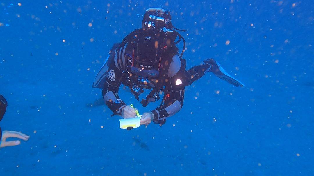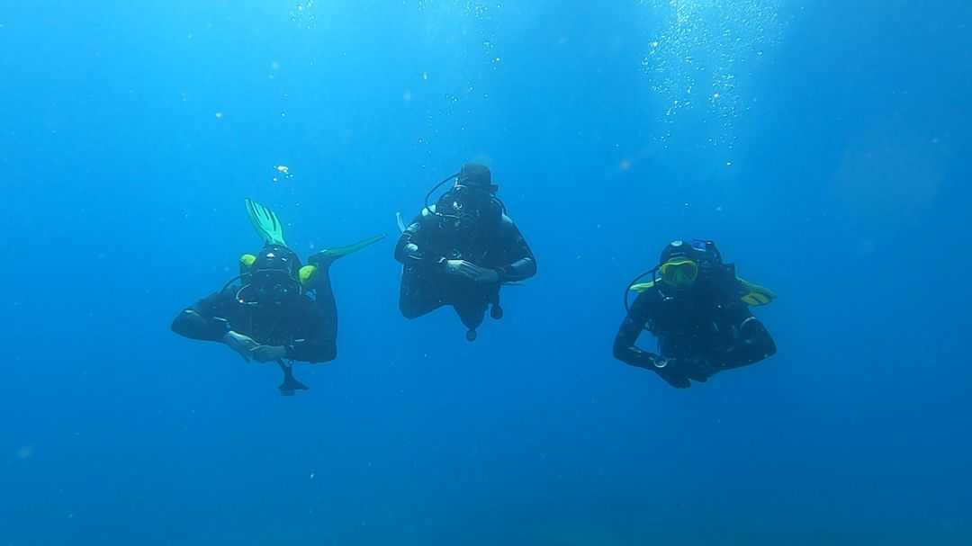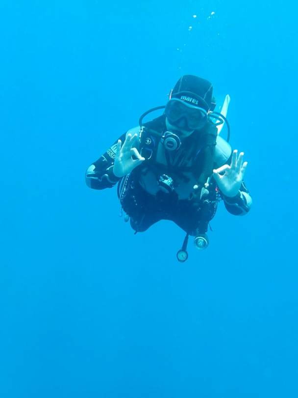 Der vierte Tag begann mit der mittlerweile etablierten Routine. Pünktlich 15 Minuten vor dem Zeitplan waren wir an der Basis und bauten die Ausrüstung zusammen. Unsere TLvD Chiara versorgt uns mit allen wichtigen Infos zum Tag und Joshua briefte, was auf uns zukommen würde: Aufgaben lösen auf Tiefe, also ein Tieftauchgang mit Deko. Noch schnell den Umkehrdruck bestimmt und los ging es nach El Mirador. Nach dem pflichtbewussten Bubblecheck ging es im Freiwasser raus und dann ab in den Rausch der Tiefe des Atlantiks.