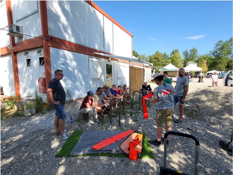 Bei 36°C im Schatten brauchten die Ausbilder nicht viel Mühe, alle schon früh ordentlich ins Schwitzen zu bringen. Nach Franks Einweisung und einer Vorstellungsrunde ging es ins Wasser zum Abkühlen. Die beiden ersten, schon teils mit Übungen gespickten Tauchgänge, boten nur kurz eine kühle Erfrischung. Dazwischen erläuterte Gerd nochmals praxisnah die Handhabung des langen Schlauchs. Nach den Tauchgängen gab es mehr Theorie, um die Tauchgänge am Sonntag vorzubereiten. David ging auf die verschiedenen Bojen und die Handhabung ein und spielte den typischen Ablauf des Bojesetzens auf Tiefe durch. Abschließend zeigte Marco am Freiwilligen (Bernd) die Flossen-Techniken, die im Fokus des SKs stehen: Frog-Kick, Flutter-Kick und Backward-Kick.