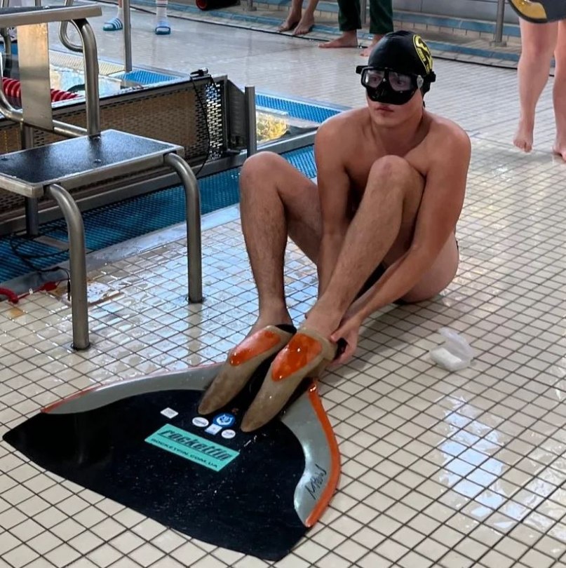 Die abschließende Staffel wurde nun in der Besetzung Silas, Leonard, Paul, Jan geschwommen. Leider lief in dieser für uns nicht mehr viel zusammen. Jan konnte leider sein Fußteil nicht von der Seife befreien, die es zum Reinkommen in die Mono benötigt. Dadurch rutschte er mit einem Fuß aus der Flosse, versuchte dieses Missgeschick zu verarbeiten und übertauchte deswegen in Gedanken die 15m nach dem Start, weswegen die Staffel leider disqualifiziert wurde.