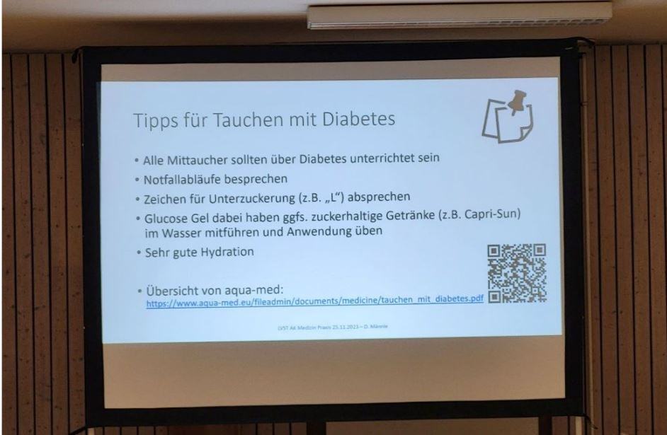 Eine der Theorieeinheit widmete sich gezielt den unterschiedlichen Einflüssen auf den Körpern beim Gerätetauchen und beim Apnoetauchen und eine Einheit widmete sich ganz im Allgemeinen den unterschiedlichen Risikogruppen (Herzprobleme, Diabetes und die 3Rs (“Rücken, Rauchen, Rheuma“) beim Tauchen und wie es dennoch möglich ist den Sport gut und sicher auszuüben. Es war keine einseitige Veranstaltung, die Teilnehmer durften ihre Fragen direkt stellen und bekamen zugleich eine fachmännische Aussage geliefert.