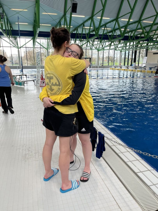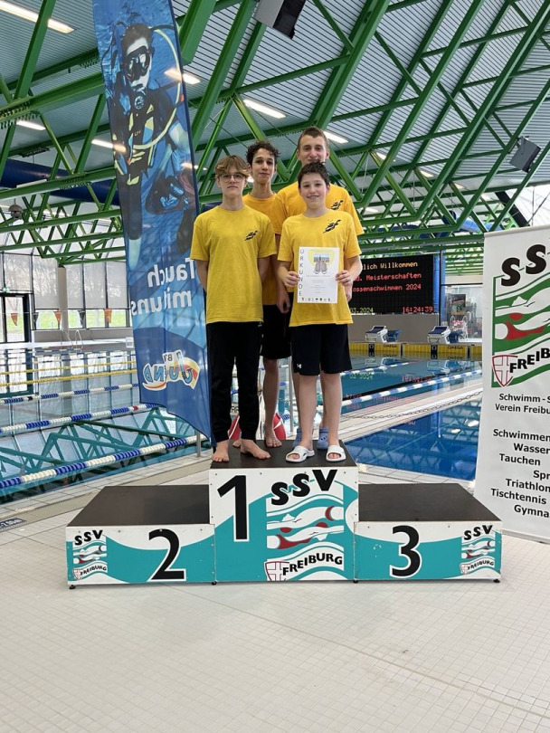 Am nächsten Morgen standen wir früh auf und aßen frischgemachte Brötchen mit Aufschnitt. Danach ging es ab zum Wettkampf ins Freiburger Westbad. An dem ersten Tag haben es Leonard, Silas, Florian und Paul geschafft, einen neuen Landesrekord in der 4×100 Meter Staffel zu schwimmen (03:33,03). Zudem schwammen Jan (01:59,62) und Leonard (02:14,75) Landesrekorde über die, 2024 neu eingeführte Strecke, 200m Streckentauchen. Zudem hat sich jeder angestrengt neue Bestzeiten zu schwimmen und Paul hat sogar einen neuen deutschen Jugendrekord für die 200 Meter BiFin (02:01,52) aufgestellt, was vom Sprecher verkündet wurde. So etwas gab es sowohl für Bingen, als auch Rheinland-Pfalz, noch nicht.