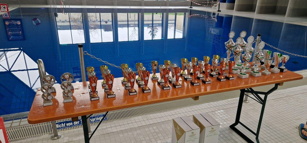 Als wir dann wieder in der Unterkunft angekommen waren, aßen wir Pizza oder (vegetarisches) Curry mit Reis. Direkt danach ging es ins Bett. Am nächsten Morgen kannten wir schon den Ablauf und fuhren zum Schwimmbad. Es wurden nochmal neue Rheinland-Pfalzrekorde geschwommen. Die 4x200m Staffel schwamm diesen in 08:16,79, Jan über 50m Apnoe in 18,84. Zudem schwamm Paul auch über 400m BiFin (04:13,69) zu einem neuen deutschen Jugendrekord. Als die Abschlussehrung kam, haben viele schon gedacht sie bekommen keinen Pokal doch das Blatt drehte sich. Jan (3. Platz Junioren), Paul (1. Platz Kategorie B), Felix (1. Platz Kategorie E/F), Elias (3. Platz Kategorie E/F), Alex (2. Platz Kategorie G), Silas (1. Platz Kategorie C), Florian (2. Platz Kategorie C) und Julia (2. Platz