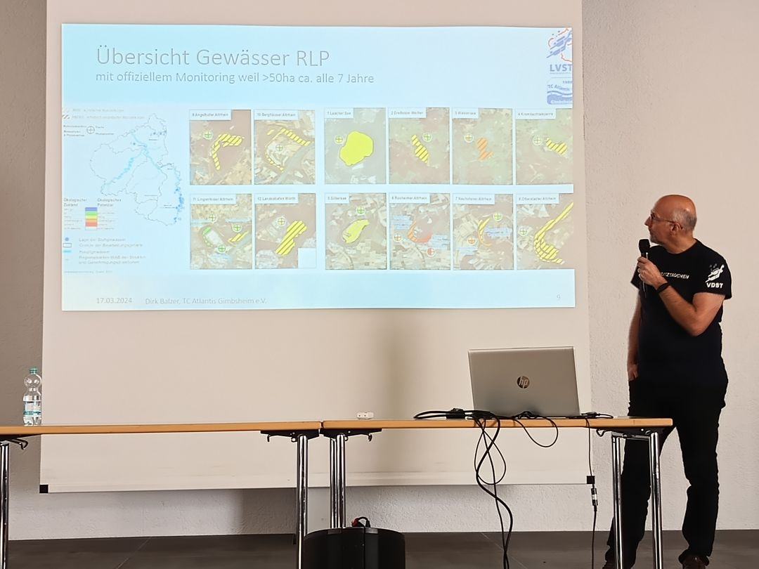 Dirk Balzer, TL Atlantis Gimbsheim, hielt einen Vortrag zum Thema Naturschutztauchen und Gewässer-Monitoring in RLP. Der Schwerpunkt lag bei der Darstelldung der aufgrund der Flora Fauna Habitatrichtlinie (FFH) in regelmäßigen Abständen zu untersuchende Gewässer in RLP.
