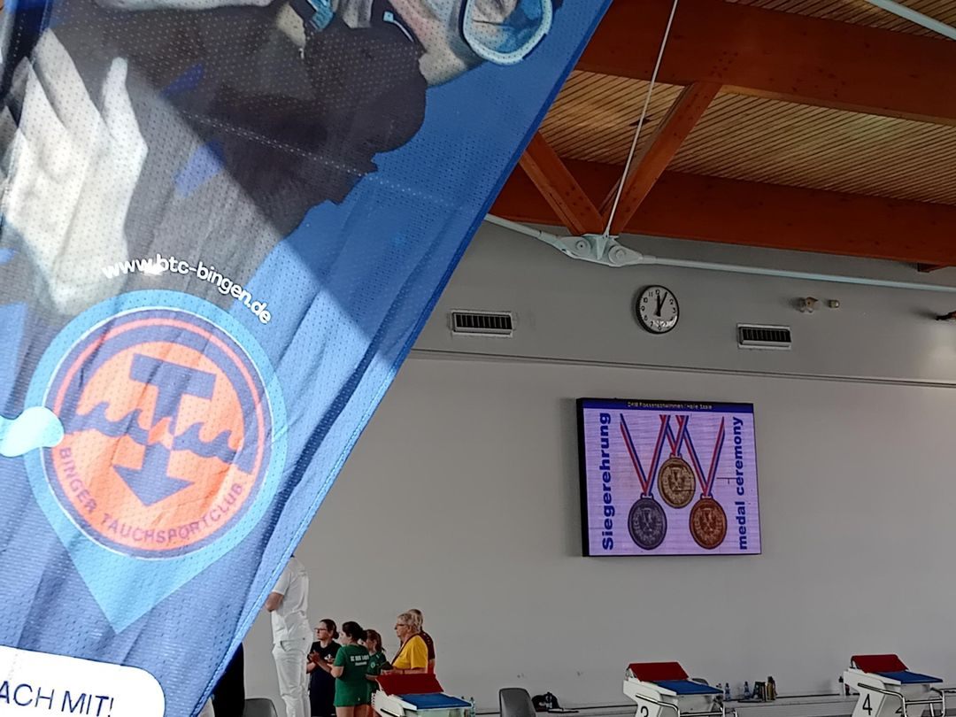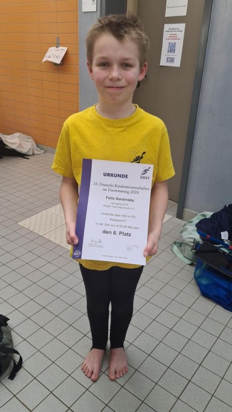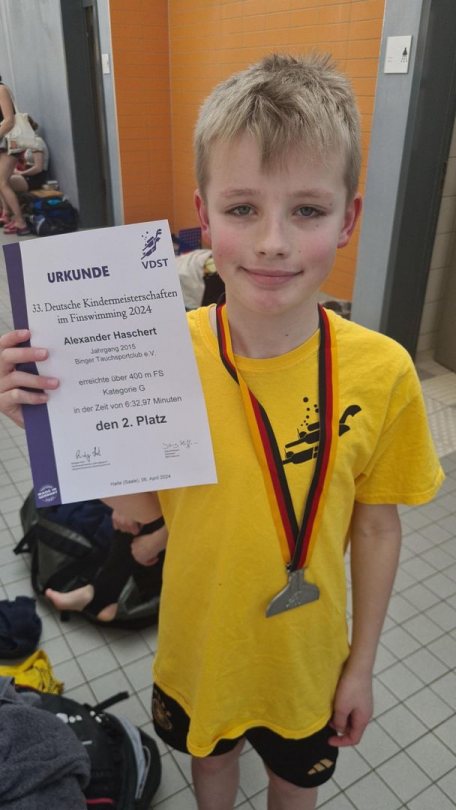 Auf der 33. Deutschen Kindermeisterschaft in Halle waren insgesamt 17 Vereine anwesend. Vom Binger Tauchsportclub e.V. waren sechs Personen da, davon drei Starter. Diese waren Elias, Felix und Alexander. Michael und Lisa waren WettkampfrichterInnen und Nadin war für die Mannschaft da. Um 09:15 Uhr wurden alle in die Halle reingelassen und um 10:30 Uhr ging der Wettkampf mit Eröffnung durch die Nationalhymne so richtig los. Alexander (06:32,97) und Felix (06:00,90) hatten beide eine neue Bestzeit auf 400m FS. Elias wurde leider disqualifiziert, wegen eines Frühstarts.