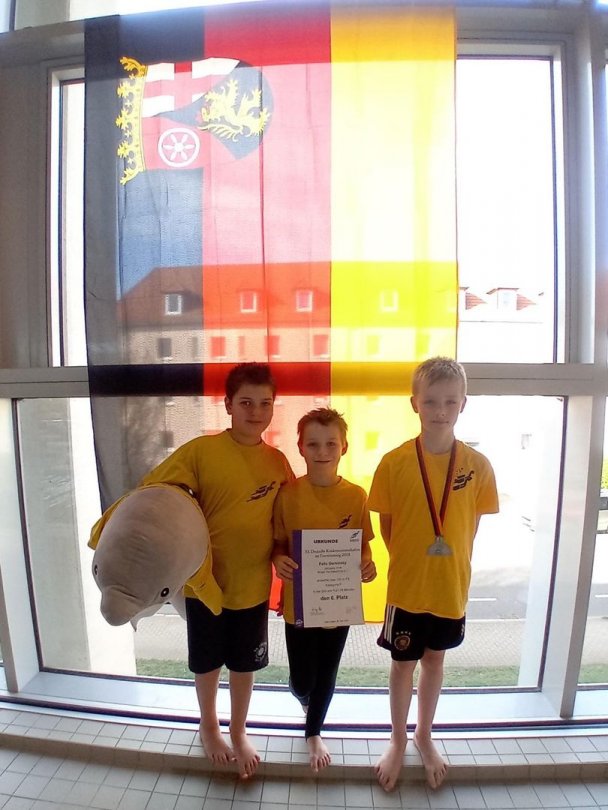 Alexander erreichte einen zweiten Platz und Felix einen sechsten Platz. Beide durften zur Ehrung. Über 50m FS wurde Alexander 5. (00:36,47, PB), Felix 6. (00:34,48, PB) und Elias 11. (00:33,53). Über 200m FS wurde Alexander wegen eines Fehlstarts disqualifiziert, Felix wurde wieder 6. (02:54,70, PB) und Elias 7. (02:47,42, PB). Über 50m Delphinbewegung wurde Alexander 8. (00:45,33, PB), Felix 6. (00:40,68, PB) und Elias auch 6. (00:36,02, PB). Über 100m wurde Alexander 9. (01:28,46), Felix wie immer 6. (01:21,74) und Elias 9. (01:14,28). Alle hatten viel Spaß und bekamen noch einen Turnbeutel als Geschenk. Außerdem haben wir ein weißes T-Shirt von der Veranstaltung als Erinnerung.