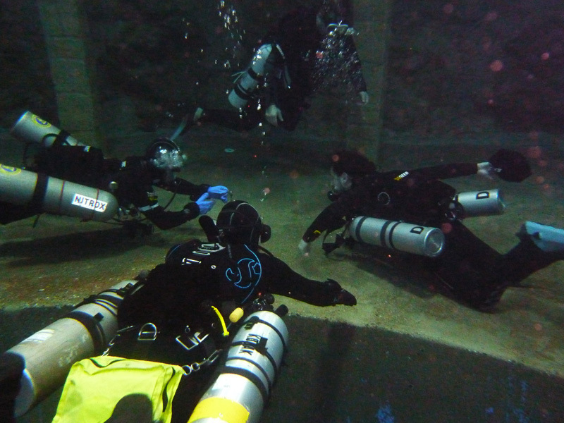 Im Einführungsvortrag gab Frank einen interessanten und zugleich sehr aktuellen Einblick in die letzten Neuerungen im Bereich Sidemount Ausbildung und Ausrüstungsempfehlungen. Diese zeigen zugleich, was unter seiner Leitung als Fachgebietsleiter Sidemount auf Bundes-Ebene im VDST mit einem Team aus mehreren Landesverbänden in den letzten Monaten erarbeitet und nun veröffentlich wurden. Quasi druckfrische Informationen aus erster Hand – was zur anschließenden Diskussionsrunde durch fachkundige Hinweise sehr positiv beigetragen hat. Die Workshop-Teilnehmer aus insgesamt fünf Landesverbänden tauschten sich angeregt und gestützt auf die zum Teil sehr große, aber auch unterschiedlichsten Erfahrung (Stahltanks im Trocki im heimischen See bis hin zu monkey style im tropischen Gewässer) aus, und sofort war erkennbar: wie beim Backmount Tauchen auch gibt es nicht nur eine Ausprägung, sondern insbesondere die Ausbilder müssen auch die Vielfalt des Sidemount Tauchens kennen und vermitteln können. In 2 Tauchgängen wurde dann im Anschluss im Rahmen von Übungen auf einige Themen (z.B. Rettung) näher eingegangen, es wurde auch am Trimm oder anderen Feinheiten gearbeitet. Eine Gruppe hat im 2. TG das Thema Stage und Stage-Handling erprobt und über Wasser wurde jede Minute zum Austausch über Material, Ausrüstungsgegenstände und individuelle Konfigurationen genutzt. Das sehr positive Feedback und der ausdrückliche Dank an Frank und seine Unterstützer Karl Kögel und David Männle durch die Teilnehmer zeigt: es war ein sehr gut geplanter und durchgeführter Workshop, bei dem sich die Sidemountler auch gut vernetzt haben und eine Fortsetzung im Freiwasser soll folgen.