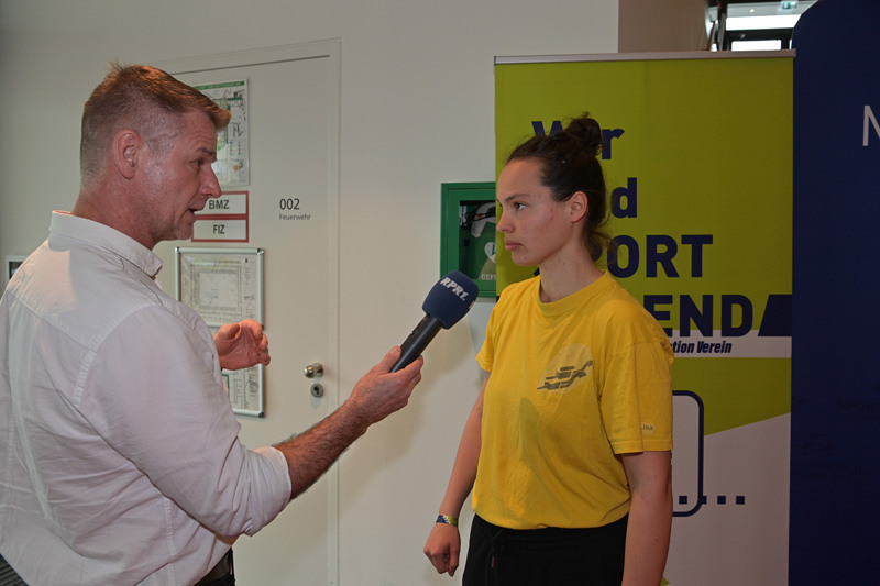 Nachdem wir vor der Fotowand fotografiert wurden, wurde ich vom RPR.1, gefühlt eine Ewigkeit, interviewt. Es wurde sich für unsere Sportart, für unsere SportlerInnen, für mich, für unsere Trainingsbedingungen und für unseren Nachwuchs interessiert. Das war eine echt außergewöhnliche Erfahrung für mich und ich hoffe, dass ich im Radio ein bisschen Werbung für diesen tollen Sport machen konnte. Der Begriff, welcher der RPR.1 Reporter nutze, um meine Rolle zu beschreiben, trifft es wohl ganz gut, denn er zog den Vergleich zur „Spielertrainerin“ im Fußball. Bevor die eigentliche Ehrung anstand, wurde es bei der Tombolaauslosung spanend. Im letzten Jahr wurden nur Sportlerinnen gezogen. Doch in diesem Jahr zog Jan das große Los. Er gewann ein großes SebaMed Paket mit nützlichem Inhalt für Schwimmer. Etwas überrascht nahm er seinen Gewinn entgegen. Als die eigentliche Ehrung dann im dritten Block anstand, wurden wir nach und nach auf die Bühne gerufen. Natürlich musste mein Schuh beim Vorlaufen aufgehen, aber ich schaffte es ohne Stolpern auf die Bühne, um für den Verein die Ehrenplakette in Bronze entgegenzunehmen. Unsere Sportler freuten sich über die Ehrennadeln in Bronze, welche schon aus dem letzten Jahr im Besitz von Flo, Paul, Silas und Leonard waren. Jan erhielt zum ersten Mal diese Würdigung seiner sportlichen Leistung. Die drei Ehrungsblöcke wurden immer mit einem kurzen Video über die Sportarten eingeleitet und auch wir waren im dritten Video zu sehen, wie wir schwammen oder jubelten. Abgerundet wurde das Programm mit Showeinlagen, z.B. vom Rope Skipping und einem abschließenden Buffet mit allem, was das Herz begehrt. Besonders schön war, dass auch Begleitpersonen an der Ehrung teilhaben durften, sodass auch Julia, Katja, Sandra und Opa sowie Oma Funke mit dabei waren.