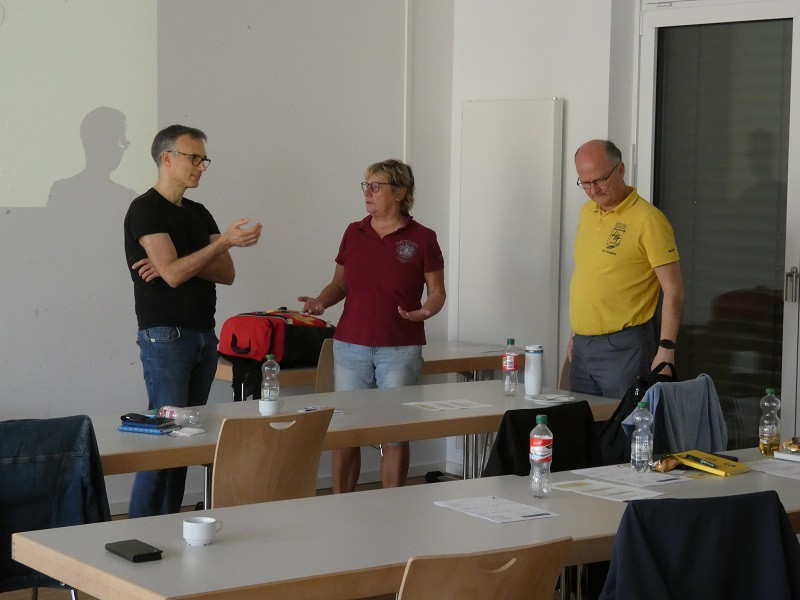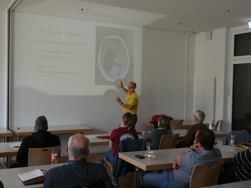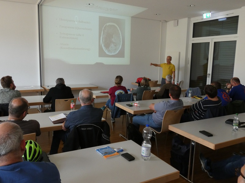 Die altbekannte stabile Seitenlage ist immer wieder unterhaltsam, die Teilnehmer waren voll dabei, auch die Aufgabenstellung für den Neurocheck waren für manche neu und als sehr sinnvoll beurteilt. Unserem Landesverbandsarzt und Sarah hörten alle sehr interessiert zu, sie gaben ihren Erfahrungsschatz aus ihrem beruflichen Umfeld an die Teilnehmenden weiter.