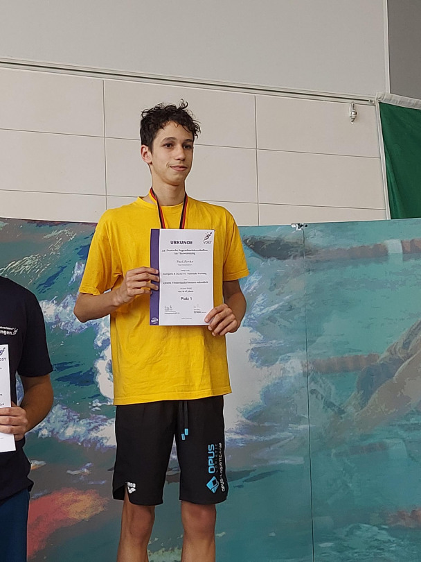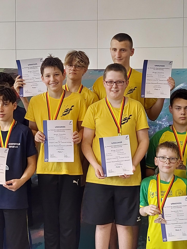 Danach kamen 1500m Flossenschwimmen. Dies schwammen Paul, Silas und Florian. Anschließend kam eine Pause und Siegerehrungen. Leonard wurde 8. mit 00:20,63. Silas wurde 7. mit 00:20,50. Florian wurde 13. mit 00:23,74, alle mit neuen Bestzeiten. Für 1500m Flossenschwimmen wurden Paul, Silas und Florian geehrte. Paul wurde in der Kategorie B (AK 16/17) Deutscher Jugendmeister mit 16:47,63 und einem neuen Landesrekord. Silas wurde in der Kategorie C (AK 14/15) ebenfalls deutscher Jugendmeister mit 17:55,43 und neuer Bestzeit. Florian wurde in der Kategorie C (AK 14/15) deutscher Vizemeister mit 18:30,90 und neuer Bestzeit.