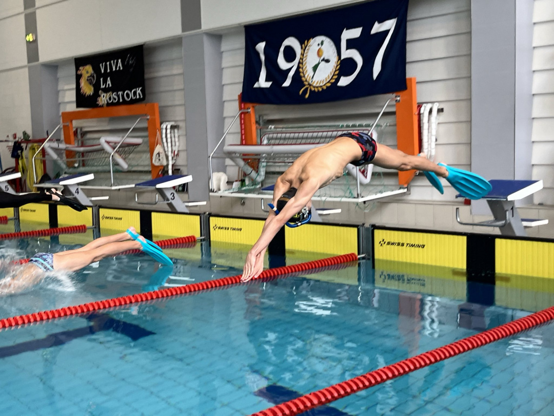 Nach dem Frühstück fuhren wir an die Schwimmhalle. Die Disziplinen waren 200BiFin, dann 100 Streckentauchen , dann 50BiFin, dann 400m Flossenschwimmen und zum krönenden Abschluss kamen die 4x100FS. Bei den 200BiFin schwammen Paul und Florian, bei 100m Streckentauchen Leonard, bei 50BiFin Paul, Florian und Silas, bei 400m Flossenschwimmen Ben, Florian, Leonard, Silas und Paul, bei den 4x100FS Staffel starteten Silas, Ben, Florian und Leonard. Bei der Siegerehrungen wurden bei 200BiFin Paul und Florian geehrte. Paul wurde in der Kategorie B (AK 16/17) deutscher Jugendmeister mit 01:56,14. Florian wurde in der Kategorie C (AK 14/15) deutscher Jugend Vizemeister mit 02:07,31 und Landesrekord.