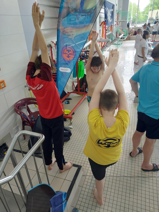 Am ersten Morgen haben wir einen leckeren selbst gepressten Saft getrunken und gut gefrühstückt. Im Schwimmbad angekommen, haben wir uns direkt eingeschwommen. Die ersten Starter aus Bingen waren bei 50m Apnoe Florian, Leonard und Silas.