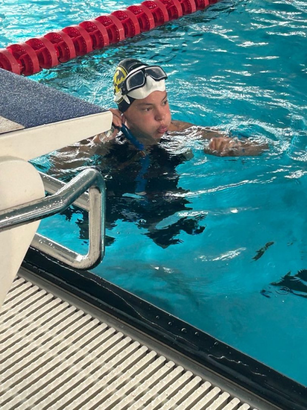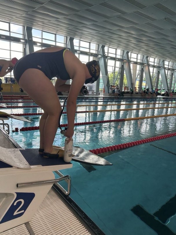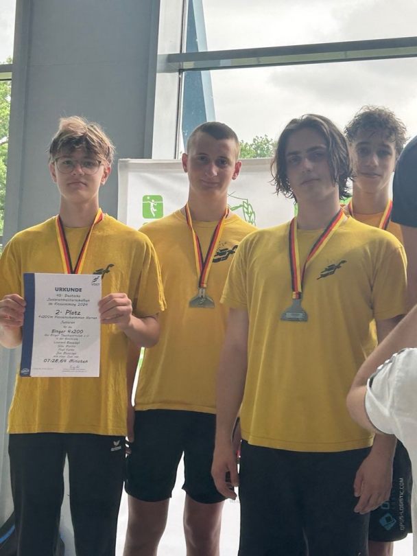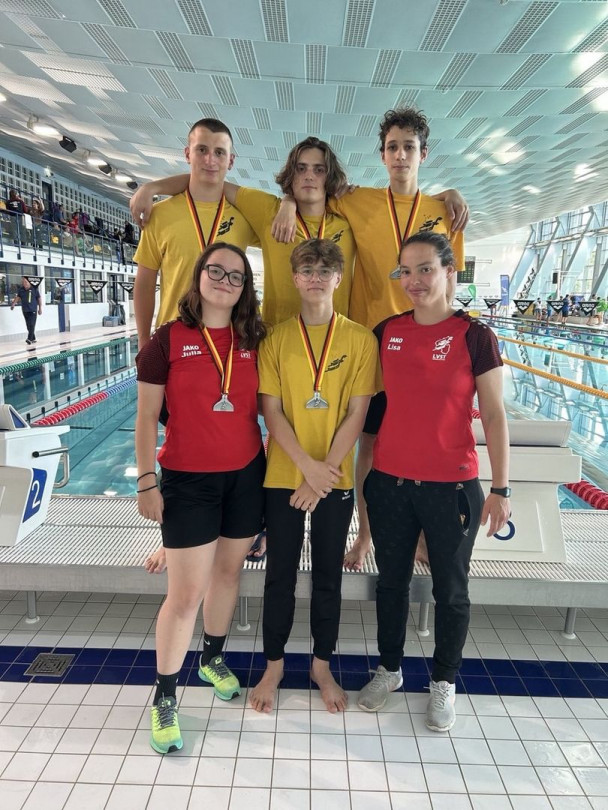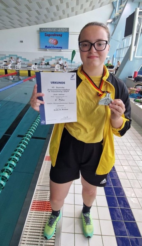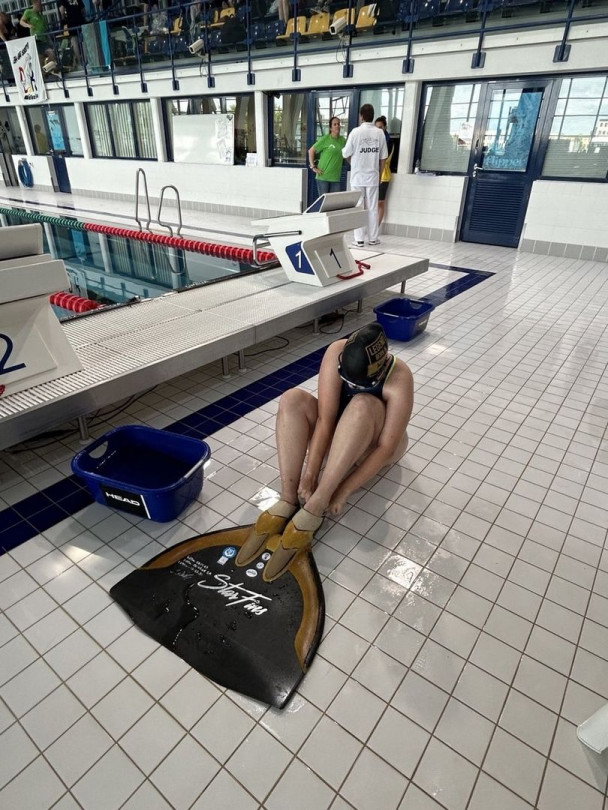 Am Samstag, den ersten Wettkampftag, mussten wir schon vor 6 Uhr aufstehen, da Einlass um 7 Uhr 15 sein sollte. Als wir also gegen kurz vor sieben am Schwimmbad ankamen aßen alle noch zwei Brötchen und dann begann der Wettkampf mit dem Einschwimmen und der Eröffnung. Die erste Strecke war die 4x50m Mixstaffel mit Walters und Blaszczyks. Wir wurden in 01:26,48 neuntbeste Staffel Deutschlands. Über 100m BiFin wurde Paul neunter (51,21) und Silas 14. (55,60 und PB). Über 100m FS wurde Lisa 30. (49,99 PB), Julia 43. (54,05), Jan 22. (45,33), Paul 29. (47,32 PB), Silas 31. (49,72) und Leonard 32. (50,79). Auf den 50m Apnoe wurde Lisa 33. (22,28), Julia 29. (21,68 PB), Jan 19. (18,12), Leonard 28. (21,06) und Silas 29. (21,12). Über 50m BiFin schwamm Paul auf Platz 8. (23,55) und Silas auf Platz 12. (24,83). Über 1500m FS durfte ich im Fast Heat starten und erreichte in 16:55,15 Platz 5. in der offenen Wertung und Silber in der Juniorinnenwertung. Über die abschließende 4x200m FS Staffel wurden die Jungs in 07:28,64 (Landesrekord) Vizemeister bei den Junioren und vierter in der offenen Wertung. Nach dem Wettkampf gingen wir noch in eine Pizzeria essen und dann fuhr ein Teil wieder in die Unterkunft.