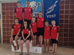 Der Binger Tauchsportclub hatte die größte Mannschaft am Start und war der einzige Verein aus Rheinland-Pfalz. Im ersten Abschnitt gab es folgende Disziplinen: 100m ST, 50m BiFin, 400m FS, alle Apnoestrecken, 100m FS und 4x50m FS – ein ziemlich straffer Zeitplan. Nach jeder Disziplin hatte man nur wenig Zeit, um sich auszuruhen, weil es immer weiter ging. Es wurden selbstverständlich auch Siegerehrungen durchgeführt, manchmal durfte Lisa diese übernehmen. Das Highlight dieses Abschnitts war der 4x50m Wettkampf, in dem der LVST Vorstand gegen den HTSV Vorstand schwamm und Sieger der Herzen wurde. Im zweiten Abschnitt wurden 100m BiFin, Hebeboje, 25m FS, 800m FS, 50m Delfinbewegung, 200m FS, 50m FS und die 4x100m Staffel geschwommen. Auch hier schafften viele Binger StarterInnen neue persönliche Bestzeiten. Insgesamt wurden vier neue Landesrekorde aufgestellt. Einen besonderen Glückwunsch an Julia, Alexander, Felix und Florian. Wir freuen uns nun auf den nächsten Wettkampf: 9.11 und 10.11 in der Rheinwelle.