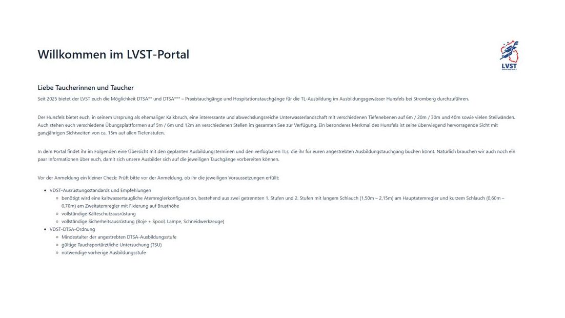 Ab sofort können Taucherinnen und Taucher ihre Praxistauchgänge für das DTSA ** und DTSA *** sowie Hospitationstauchgänge für die TL-Ausbildung direkt beim LVST in Hunsfels absolvieren und auch bequem online über das neue LVST-Praxisportal buchen.