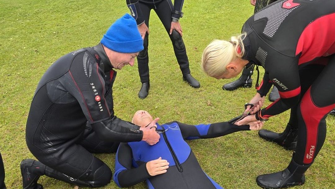 Unser stellvertretende Landesverbandsarzt Dr. Ulrich Döhner erklärte in seiner Doppelrolle als Patient und Arzt, wie und an welchen Stellen so ein Anzug aufzuschneiden ist, damit ein verunglückter Taucher vom Rettungsdienst verarztet werden kann. Dies wurde von den Anwesenden dann praktiziert.