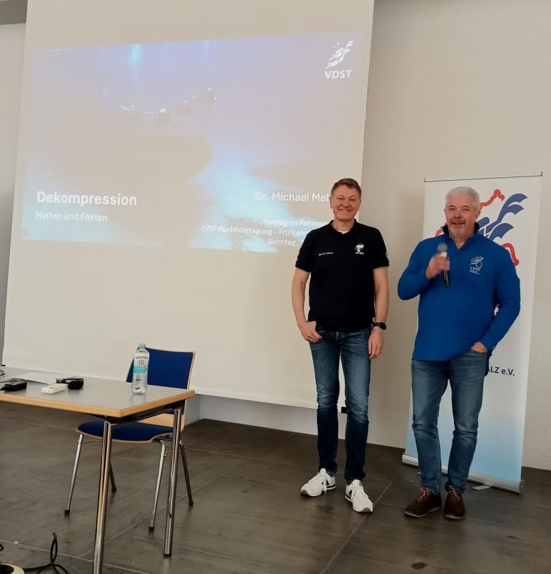 Der zweite Höhepunkt führte uns in den Bereich der Dekompressionstheorie. Dr. Michael Melter und in die mehr oder minder weit verbreiteten Dekomythen. Auch hier wurde wieder deutlich, dass es nicht so einfach ist mit den Antworten. Welcher Tauchgang ist ein Dekotauchgang (jeder), helfen Deepstops (kommt drauf an – eher nein), was ist wichtiger: viel trinken, Sport am Tag vor dem TG oder Wärme nach dem TG (hilft alles, aber vor allem eine gesunde Grundfitness…. Durch das kleine Mitmachelement (Abstimmungen über die Seite www.mentimeter.com) wurden die Mythen zur Abstimmung gestellt. Well done…..