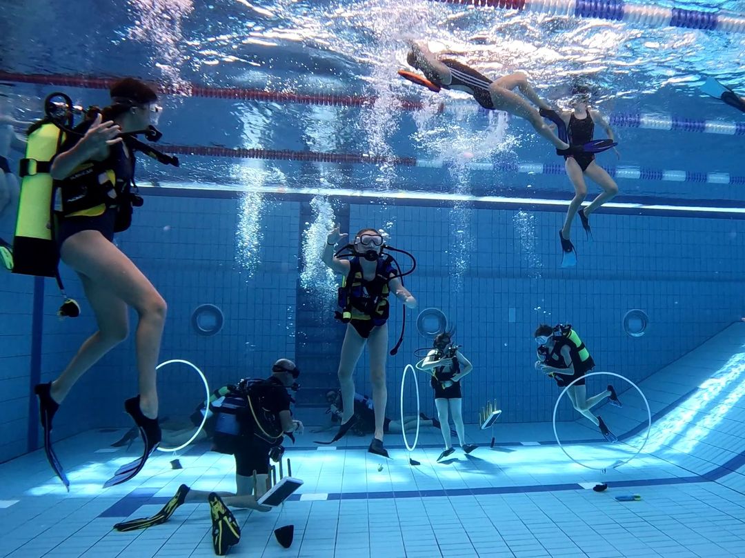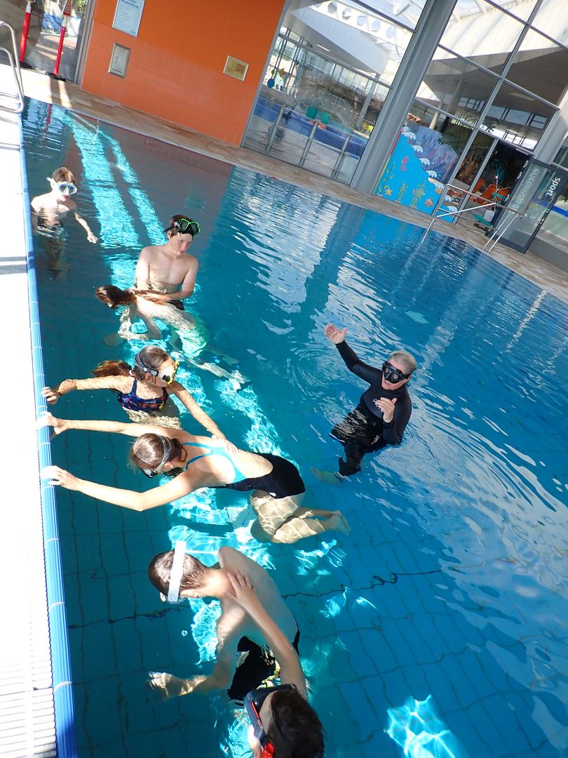 Am Donnerstag hatte sich das Prozedere schon eingespielt. Die Tauchsachen wurden am Beckenrand verteilt, die Gruppen wurden etwas variiert, denn wir hatten teilweise andere Betreuer am Beckenrand und unter Wasser. Außerdem war eine Schülerin dazugekommen, die am Mittwoch nicht dabei sein konnte. Wie es sich herausstellte, war das aber kein Problem, sie war wie die anderen auch ein Naturtalent. Der Ablauf war wie am Vortag. Wir verbrachten wieder eine schöne Zeit unter Wasser. Alle Spielsachen wurden nochmal durchprobiert und so manche/r wollte gar nicht mehr auftauchen. Wir würden uns freuen, wenn einige dieser SchnuppertaucherInnen zu uns in den Tauchverein kommen würden.