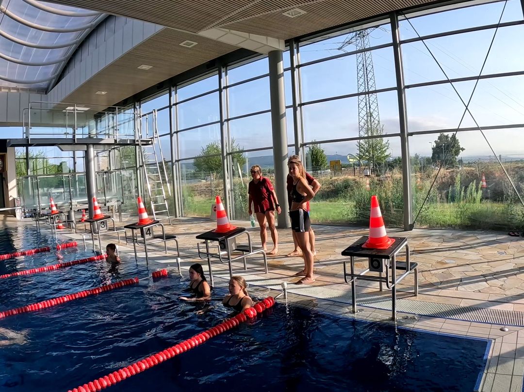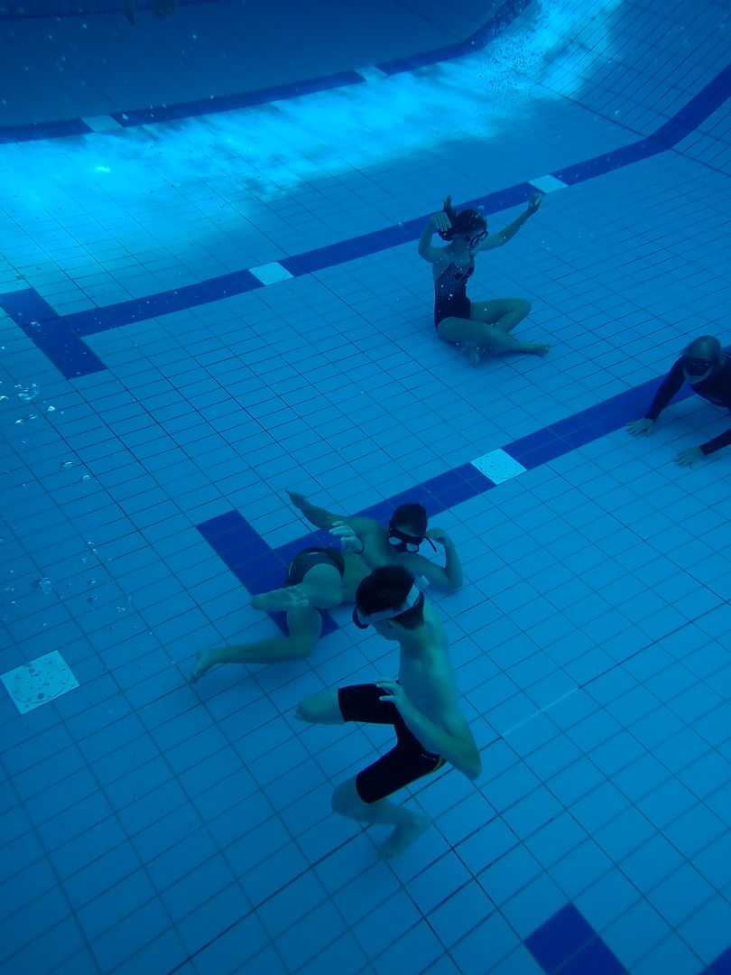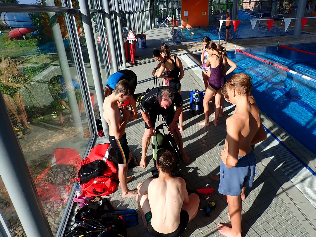 Im Wasser hatten wir Reifen verteilt, durch die man tauchen konnte, UW-Torpedos und einen UW-Ball, der mit Salzwasser gefüllt ist, damit man unter Wasser damit werfen kann und einen Wiggle Tower, also ein UW-Jenga. Nach einer halben Stunde war dann Wechsel. Die zweite Gruppe übernahm das Tauchgerät und die erste Gruppe war dann dran mit Flossenschwimmen. Dabei wurden auch viele Rettungsübungen gemacht und die verschiedenen Griffe gezeigt, mit denen man verunglückte Schwimmer oder Taucher abschleppen kann. Viel zu schnell war die Zeit vorbei und das ganze Gerät wurde wieder nach draußen geräumt (wir durften den direkten Eingang zum Schwimmbecken benutzen, was uns viel Schlepperei erspart hat) und Kai lud alles in seinen Bulli. Für ihn war der Tag noch lange nicht vorbei, er musste am Nachmittag noch ca. zweieinhalb Stunden lang mit dem Kompressor die Flaschen wieder füllen für den nächsten Tag.