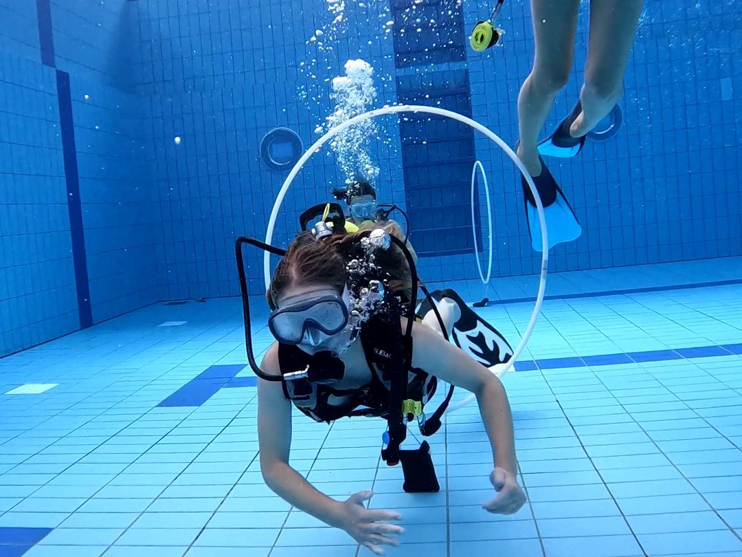 Am Mittwoch fand dann endlich das erste Gerätetauchen statt, aber vor dem Spaß kam die Arbeit, denn das ganze Gerät musste erst mal an den Beckenrand geschleppt werden. Die Gruppen wurden ein- und den erfahrenen Tauchern zugeteilt, die Jackets anprobiert, die Atemregler verteilt. Dann duften sich die Kids einschwimmen und vom 3m-Brett springen, während die Vereinstaucher ihr Gerät zusammenbauten. Während dann die eine Gruppe Flossenschwimmen machte, baute die erste (Gerätetauch-)Gruppe unter Anleitung ihre Tauchgeräte zusammen und dann ging’s endlich ins Wasser. Und es war genauso, wie wir es aus den letzten Jahren schon kannten: Die Kids tauchten noch etwas unsicher ab, aber spätestens, wenn sie mit den UW-Spielgeräten, die im Becken verteilt waren, spielten, war von der Unsicherheit nichts mehr zu merken. Wir übten dann auch mit Gerät nochmal die Maske ausblasen und ich war beeindruckt, mit welcher Selbstverständlichkeit die Kids im weiteren Tauchgang mal schnell ihre Maske ausbliesen, wenn sie wieder mal beschlagen war.