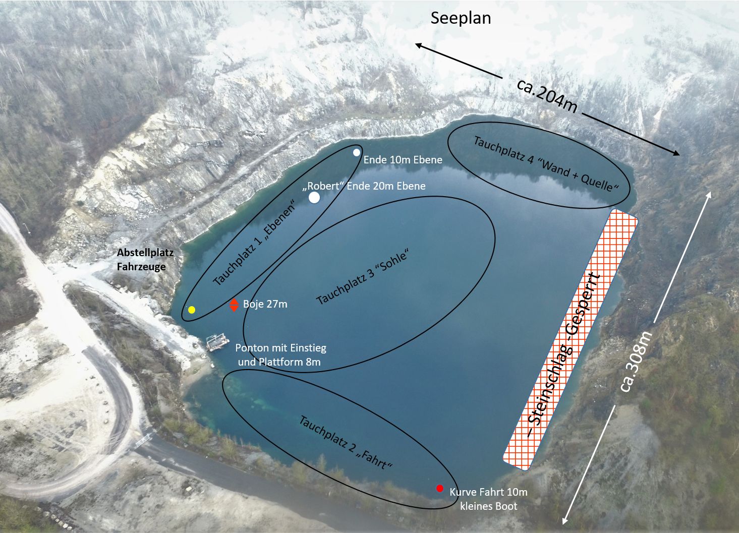 Gut für uns Taucher: Er bietet klares Wasser mit Sichtweiten von über 10 m, mit Steilwänden und Tiefen bis zu 54 m (unterhalb von 40 m nur für Tech-Taucher erlaubt) und sehr gechillte Fische. Die Wassertemperatur ist allerdings eindeutig Trocki geeignet, liegt im Frühsommer im hohen einstelligen Bereich und krabbelt im Hochsommer dann in einen niedrigen zweistelligen Bereich, außer in den oberen 7 m, da ist es dann eigentlich ganz angenehm. Inzwischen ist der See für Taucher hergerichtet mit vier verschiedenen Tauchplätzen, Pontons und Treppen für den Ein- und Ausstieg, Übungsplattformen und einem Segelboot in 20 m Tiefe.