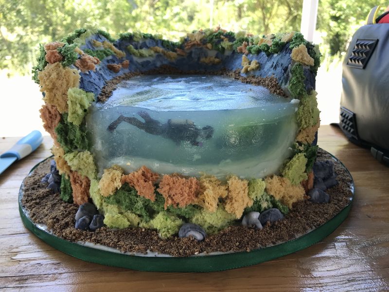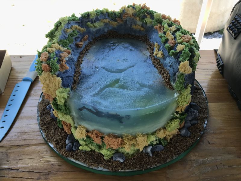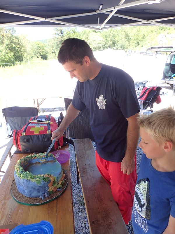 Nach so viel Trockenübungen legten wir eine Pause ein und machten uns über die mitgebrachten Fressalien her und dieses Mal gab es nicht nur den üblichen Nudelsalat, ohne den ein Kurs eigentlich gar nicht stattfinden kann und dazu noch andere leckere Salate, Dips und Kuchen, nein es gab eine Hunsfels-Torte. Miriam, Marc und Ben haben sie mitgebracht, denn sie haben eine Kollegin, die solche Themenkuchen backt, gestaltet, bastelt – ich weiß gar nicht, wie ich den Herstellungsprozess richtig beschreiben soll. Schaut einfach selbst und achtet mal auf die Details!