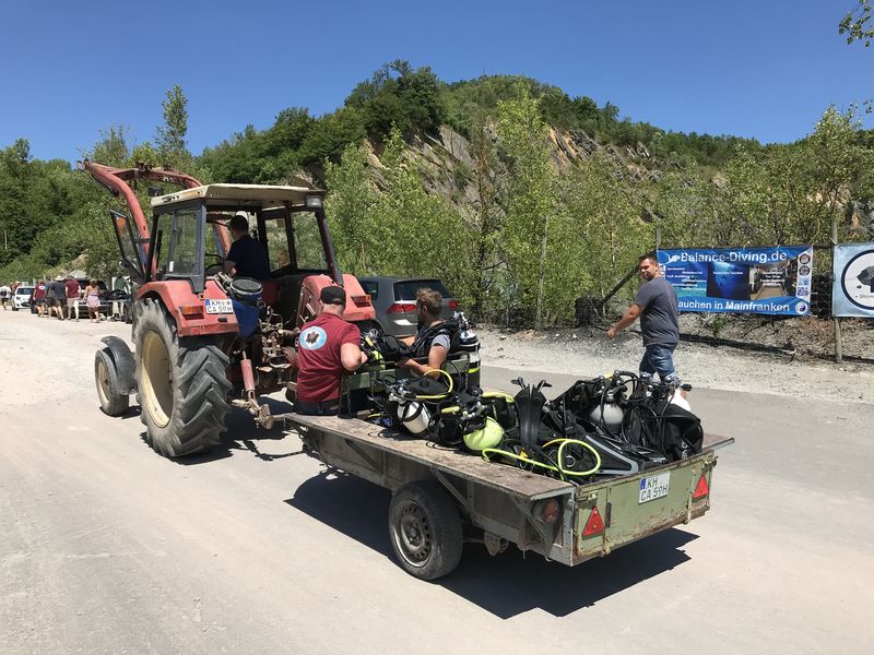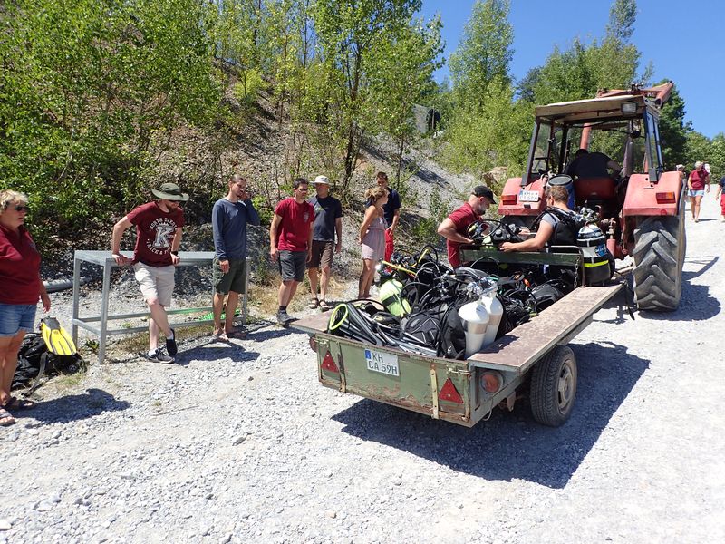 Danach folgte die Gruppeneinteilung und ein ausführliches Briefing mit einem gründlichen Gerätecheck, erst dann ging’s ins Wasser. Freundlicherweise brachte Johannes die ganzen Geräte mit dem Traktor zum Einstieg.