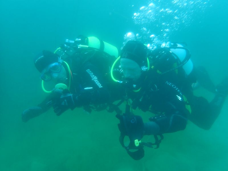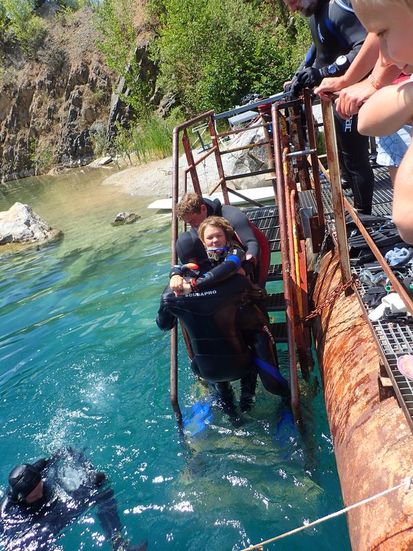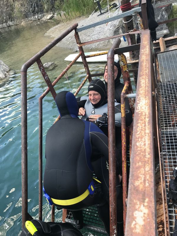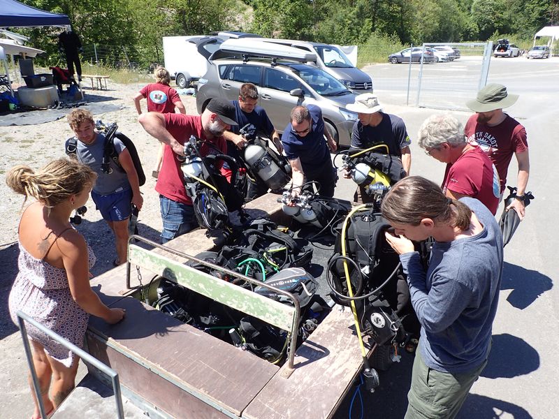 Das Wetter am Hunsfels hätte nicht besser sein können, die Sonne schien vom blauen Himmel. Es war Sommerwetter pur. Leider hatte es auch ganz viele andere Taucher an bzw. in den See gelockt, sodass am Samstag unter Wasser so einiges geboten war, zumindest was Tauchgruppen angeht und am Ein- und Ausstieg kam es durchaus auch mal zu kleinen Staus. Rüdiger hatte uns einen eigenen Pavillon zur Verfügung gestellt und so konnten wir abseits der anderen Taucher unseren Kurs abhalten.
