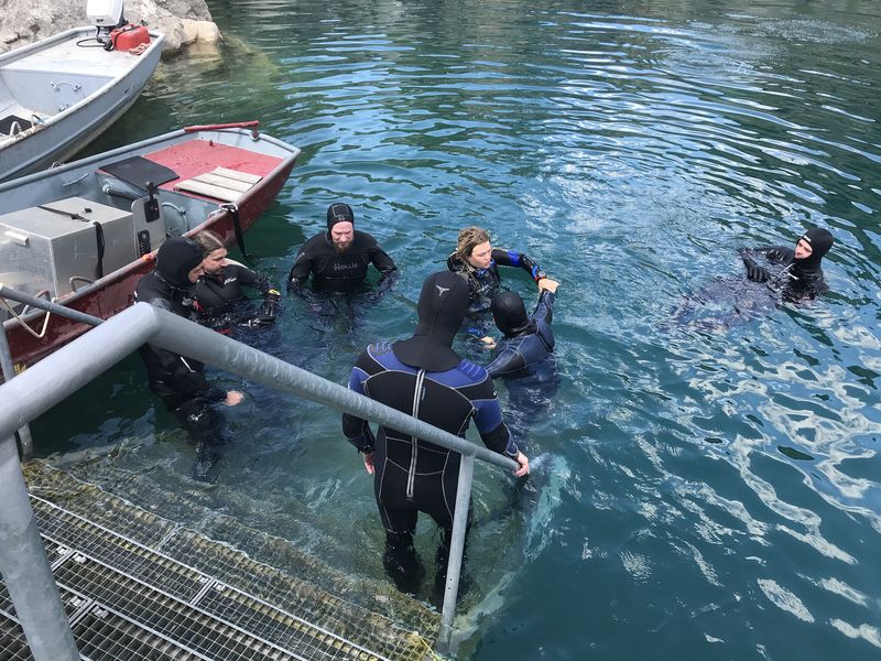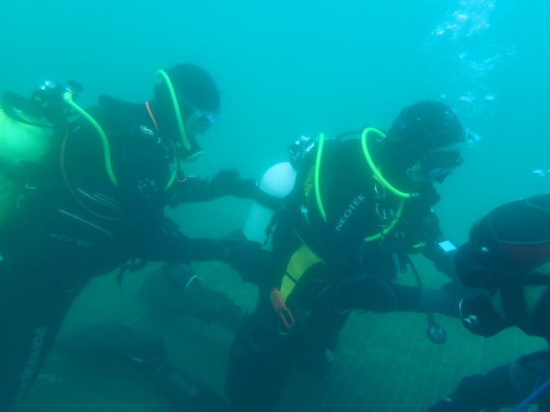 Am Sonntag gab es zusätzlich noch ein Angebot zum Apnoe-Tauchen. Bevor es zu den nächsten Übungstauchgängen für TSR ging, konnte jeder Zeittauchen, Streckentauchen und Tieftauchen ausprobieren. Diese Disziplinen gehören auch zur DTSA-Ausbildung und bei dieser Gelegenheit, konnten wir die notwendigen Abnahmen machen. Steven und ich betreuten das Zeittauchen, Bert und Kai das Streckentauchen und Ines und Frank das Tieftauchen. Und als alle wieder zurück beim Einstieg waren, wurden (wie am Samstag schon auf dem Trockenen geübt) reihenweise „verunglückte“ Taucher über die schmale Treppe hochgeschleppt.