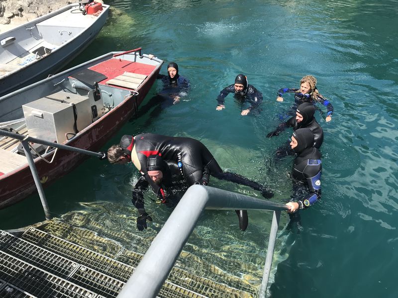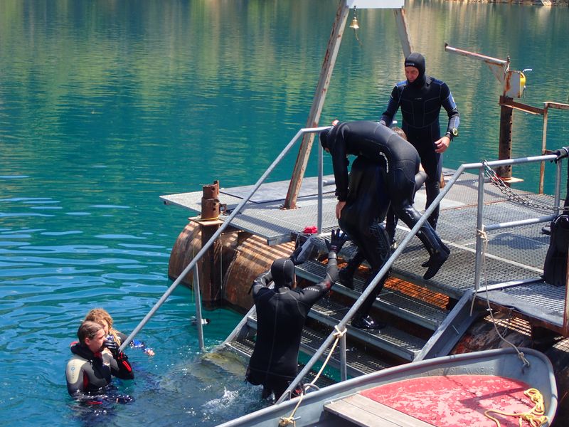 Beim anschließenden Tauchgang standen Blei-Check, Mund-Nase-Reflex, tauchen ohne Maske und tauchen mit nur einer Flosse auf dem Programm. Da konnten wir die Übungsplattformen gut nutzen.