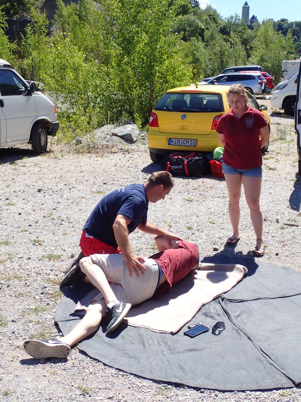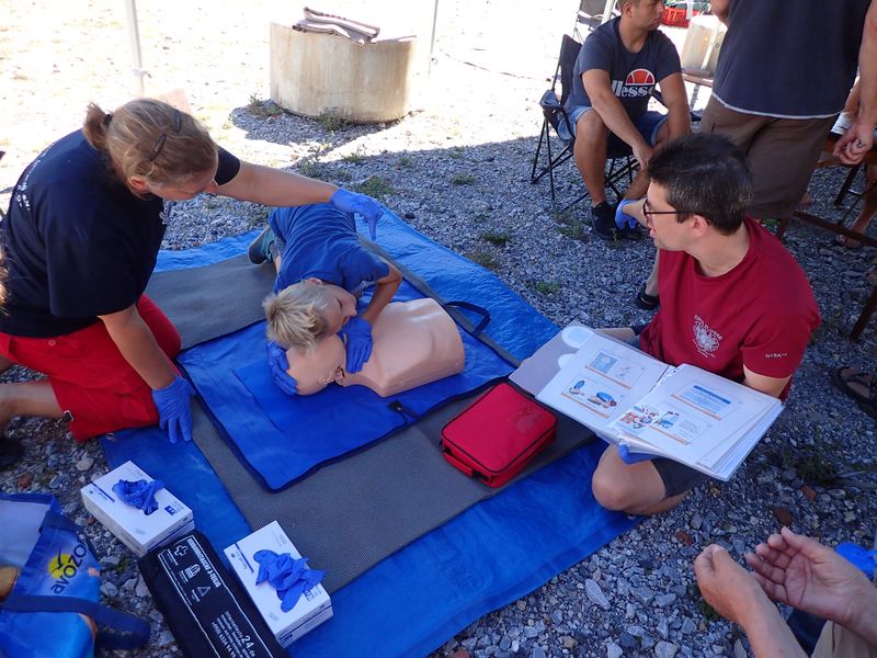 Wie im letzten Jahr haben wir verschiedene Stationen aufgebaut. Bei Ines und Bert wurde gezeigt, wie man einen verunglückten Taucher alleine oder zu mehreren über eine Treppe rettet (das wurde dann am nächsten Tag am Einstieg „in echt“ ausprobiert) und Seemansknoten geübt, der Palstek ist ja zumindestens den angehenden DTSA***-Tauchern bestens bekannt. Annka und ich stellten nochmal die erste Hilfe mit Sauerstoffflasche vor, erstellten ein Tauchgangsprotokoll, machten einen Neuro-Check und übten die stabile Seitenlage und bei Frank wurde die HLW geübt und die Flotte Lotte mit dem Defibrillator wiederbelebt. Und weil man damit nie früh genug anfangen kann, machte auch der „kleine“ Ben (zur Unterscheidung vom „großen“ Ben), Sohn von unseren Teilnehmern aus Wittlich Miriam und Marc fleißig mit.