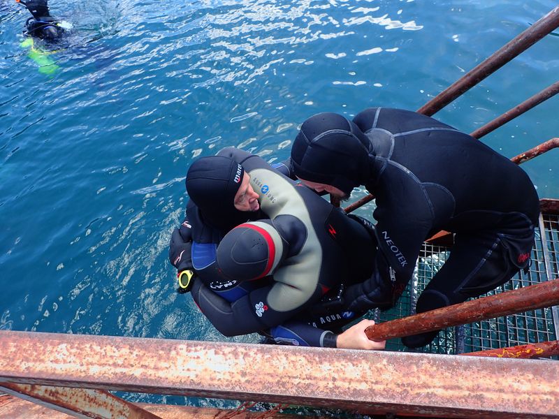 Jeder musste mal ran, Aufgaben gab es genug: den verunglückten Taucher von Gerät und Bleigurt befreien und alles inclusive des Tauchers sichern und dann den Taucher zum Boot bringen. Einer musste sich (auch ohne Gerät) am Rand des Bootes festhalten und so eine Rampe bilden, über den der Taucher dann ins Boot gezogen und geschoben wurde. Wer erfolgreich gerettet war, durfte dann den nächsten herausziehen. Er funktionierte verblüffend gut.