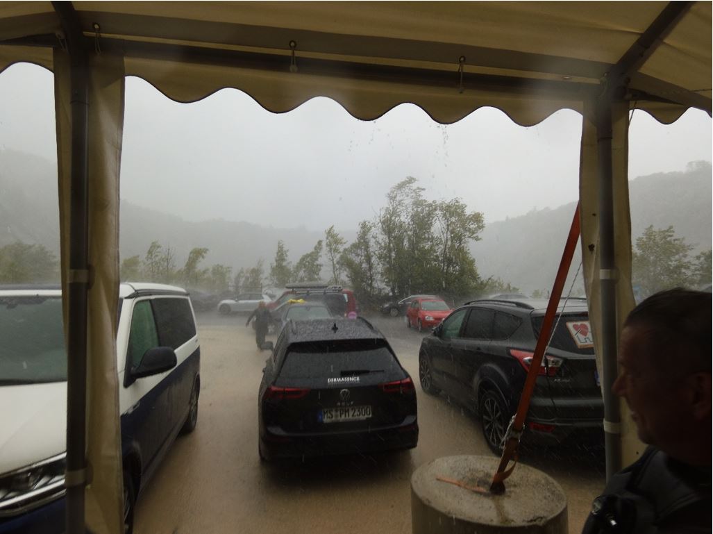 Trotz Gewitter mit Platzregen kamen gute Gespräche und nette Stimmung vor Ort bei angenehmer Geselligkeit zustande. Auch wenn der Regen von oben und die „Gebirgsbäche“ von unten (die alle Klamotten verschlammten) kamen, waren es freundliche Unterwasserbedingungen und die feste Absicht für ein "bald wieder" so einen Tauchgang (wenn auch bei schönerem Wetter) durchzuführen.