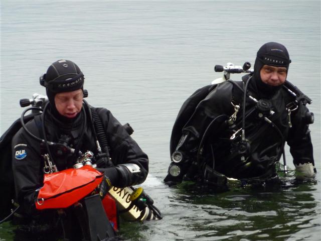 Ohne unsere Ausbilder trafen wir, die Kursteilnehmer, uns nochmals zu einem Trainingstag, um das Stage Handling und die Skills zu üben. Bei wunderbarer Infrastruktur im Clubhaus eines heimischen Clubs und bester Versorgung mit super Chili durch Clemens, haben die Übungstauchgänge an diesem Tag richtig Spaß gemacht. Bei den vielen Übungen verging die Zeit im Wasser wie im Flug und die Tauchgänge wurden deutlich länger als geplant - im Wasser kam uns das gar nicht so lang vor. Besonders fiel uns dabei auf wie prima wir als Team sowohl über als auch unter Wasser zusammenarbeiteten. | Clemens und Werner | |