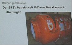 Druckkammerseminaren informiert. Ganz besonders hervorzuheben ist, dass die Druckkammer in Überlingen von rein ehrenamtlich Tätigen bedient wird. 10 Mitarbeiter arbeiten in 24 Std.-Bereitschaft, um schnellstmöglich verunfallten Tauchern die optimale Versorgung zukommen zu lassen.
