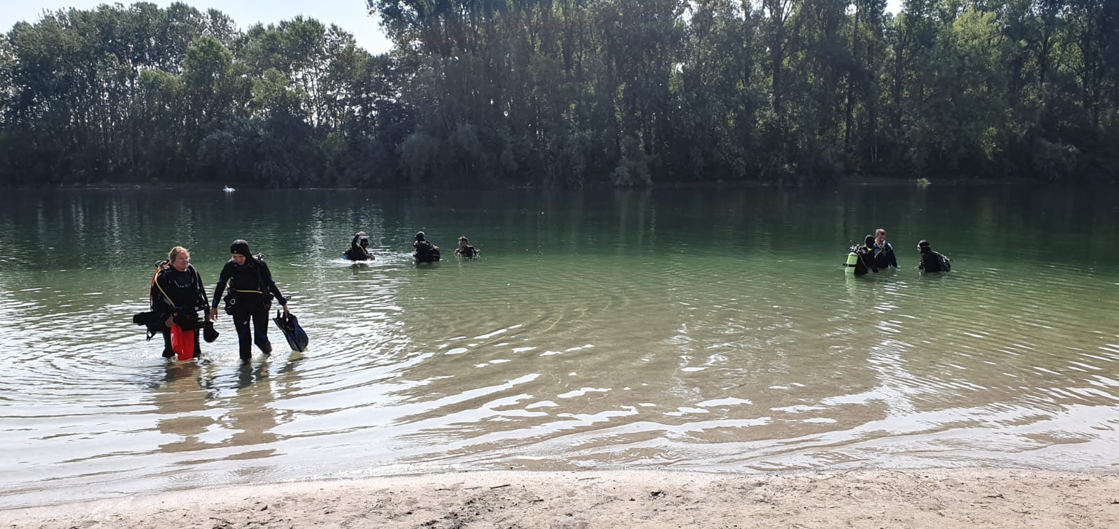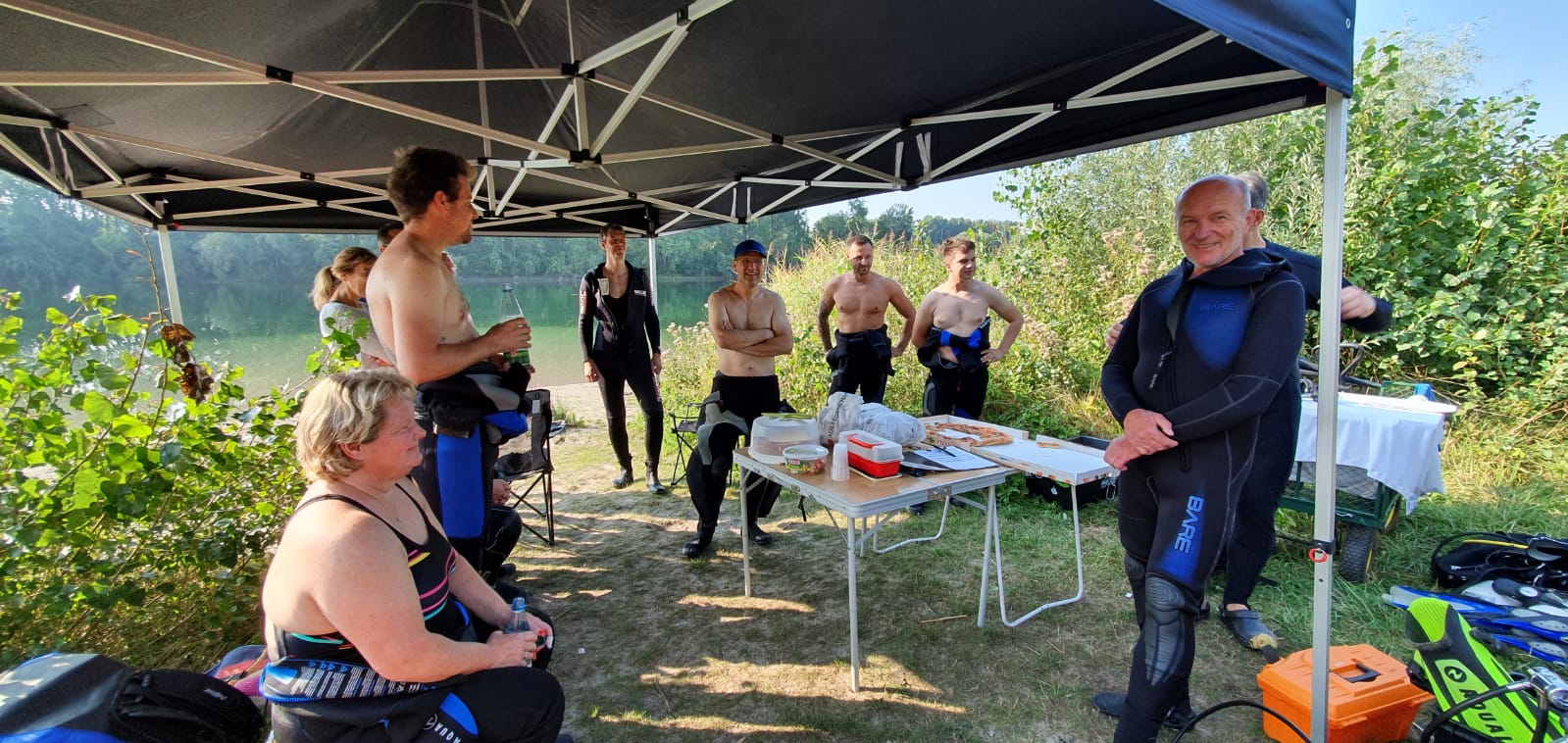 Die am Ufer sitzende Sicherung wie auch andere Teilnehmer schmunzelten immer wieder über die auf einmal so unbeholfenen Tauchlehrer. Fehlende Flossen, abgeklemmter Inflatorschlauch, kein Tauchcomputer, Flaschen nicht aufgedreht, Blei vergessen und und und und…..