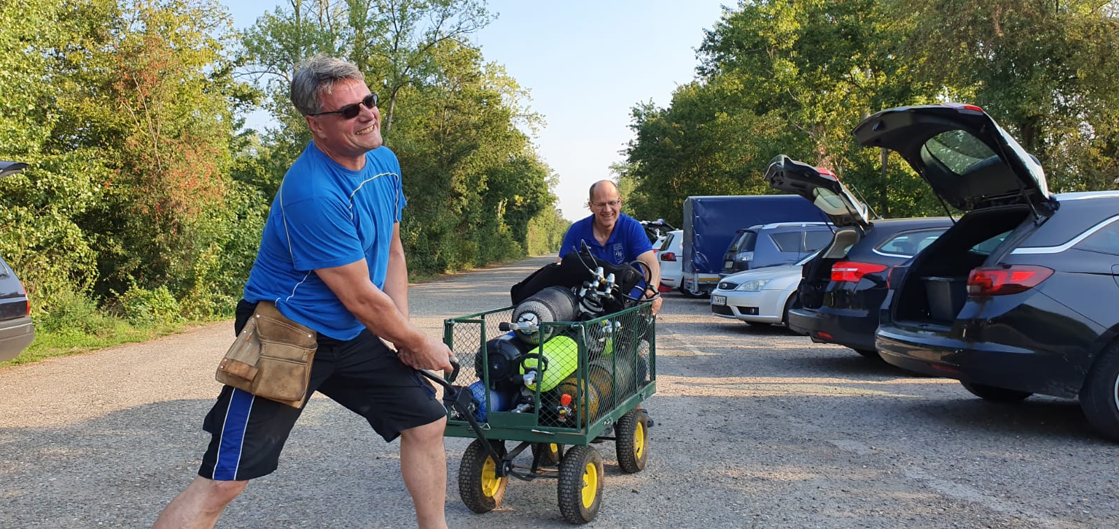 Auf zum Altriper Jägerweiher. In langen Karawanen wurde bei herrlichstem Wetter die Ausrüstung zum Ufer gebracht.