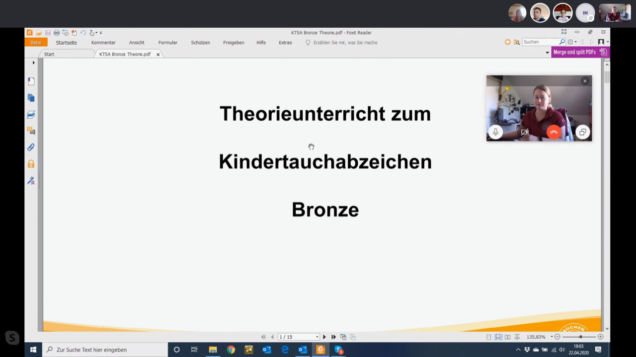 Aufgrund der guten Erfahrung mit dem Online-Aufklärungsgespräch haben wir jetzt auch mit der Online-Theorie-Ausbildung begonnen, denn wir wollen die wasserfreie Zeit sinnvoll nutzen. Schon die im Winter begonnene Theorieausbildung für KTSA Silber und Gold und DTSA* konnten wir nicht wie sonst mit einer gemeinsamen Prüfung beenden, sondern wir ließen die Prüflinge die Prüfungen in kleinen Gruppen via Skype ablegen.