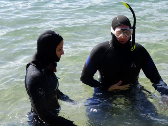 Dann konnte jeder an der Boje in 5m Tiefe den Bleicheck durchführen, um sich auf die Besonderheiten beim Strecken- und Tieftauchen vorzubereiten. Für das anschließende Streckentauchen waren 2 Bojen im Abstand von 40m mit dem Führungsseil (Reel) verbunden. Leider war die Sicht mit ca. 6m nicht optimal und so kostete es Überwindung, die vorgeschriebenen Strecken am Seil entlang zu tauchen. Allen Teilnehmern wurde klar, wie wichtig dabei die gegenseitige Absicherung ist und wieviel Konzentration sie erfordert.