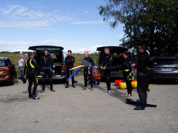 Am Sonntagmorgen trafen wir uns am Brechtsee bei Rheinsheim für die weiteren praktischen Übungen. Wir konnten uns bei sehr gutem Wetter mit Entspannungsübungen auf das Tieftauchen vorbereiten. Nach dem Anlegen der Ausrüstung wurden in Gruppenarbeit zwei Bojen für das Tieftauchen vorbereitet und ins Wasser gebracht.