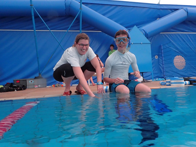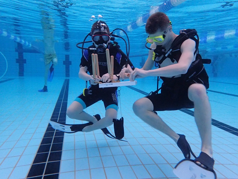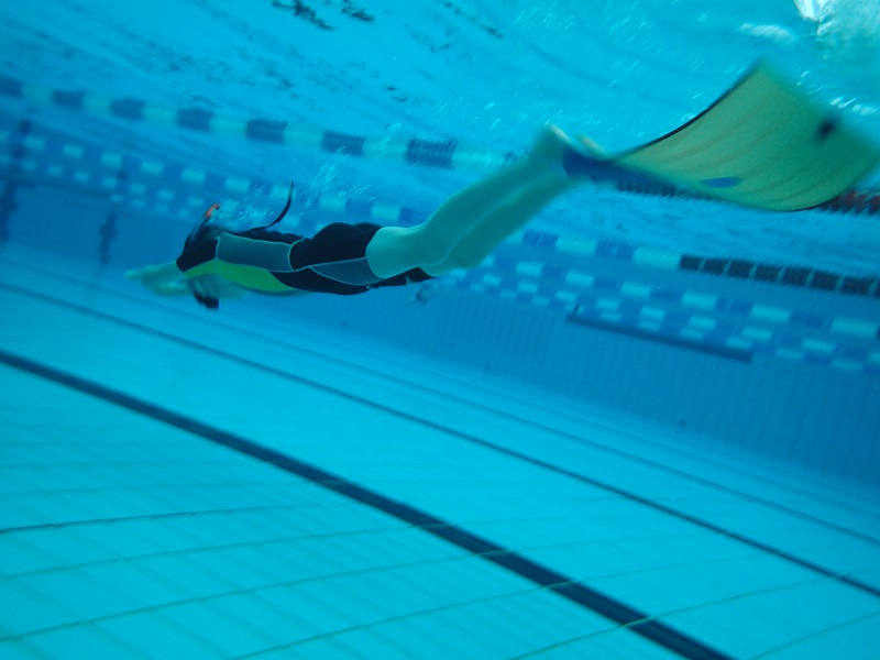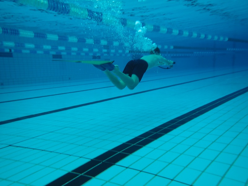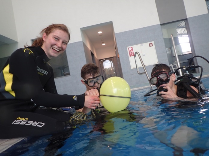 Unterwasser wurden aber auch verschiedene physikalische Experimente durchgeführt, zum Beispiel anhand eines Luftballons, wie sich Druck auf den Körper auswirkt. Neben dem Tauchen mit Gerät bekamen die Schülerinnen und Schüler auch die Möglichkeit Finswimming mit Monoflosse auszuprobieren und damit eine ihnen bis dahin eher unbekannte Wassersportart kennen zu lernen.