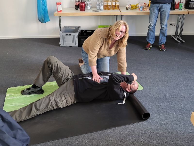 Die Station mit der altbekannten stabilen Seitenlage ist immer wieder unterhaltsam, die Teilnehmer waren voll dabei. Auch da gilt: Übung macht den Meister und ab dem zweiten Mal klappte das schon viel besser. Die Aufgabenstellung, den Neurocheck durchzuführen, war für manche neu und wurden als sehr sinnvoll beurteilt. Unseren Landesverbandsarzt Uli und Sarah hörten alle sehr interessiert zu, sie gaben ihren Erfahrungsschatz aus ihrem beruflichen Umfeld an die Teilnehmer weiter.